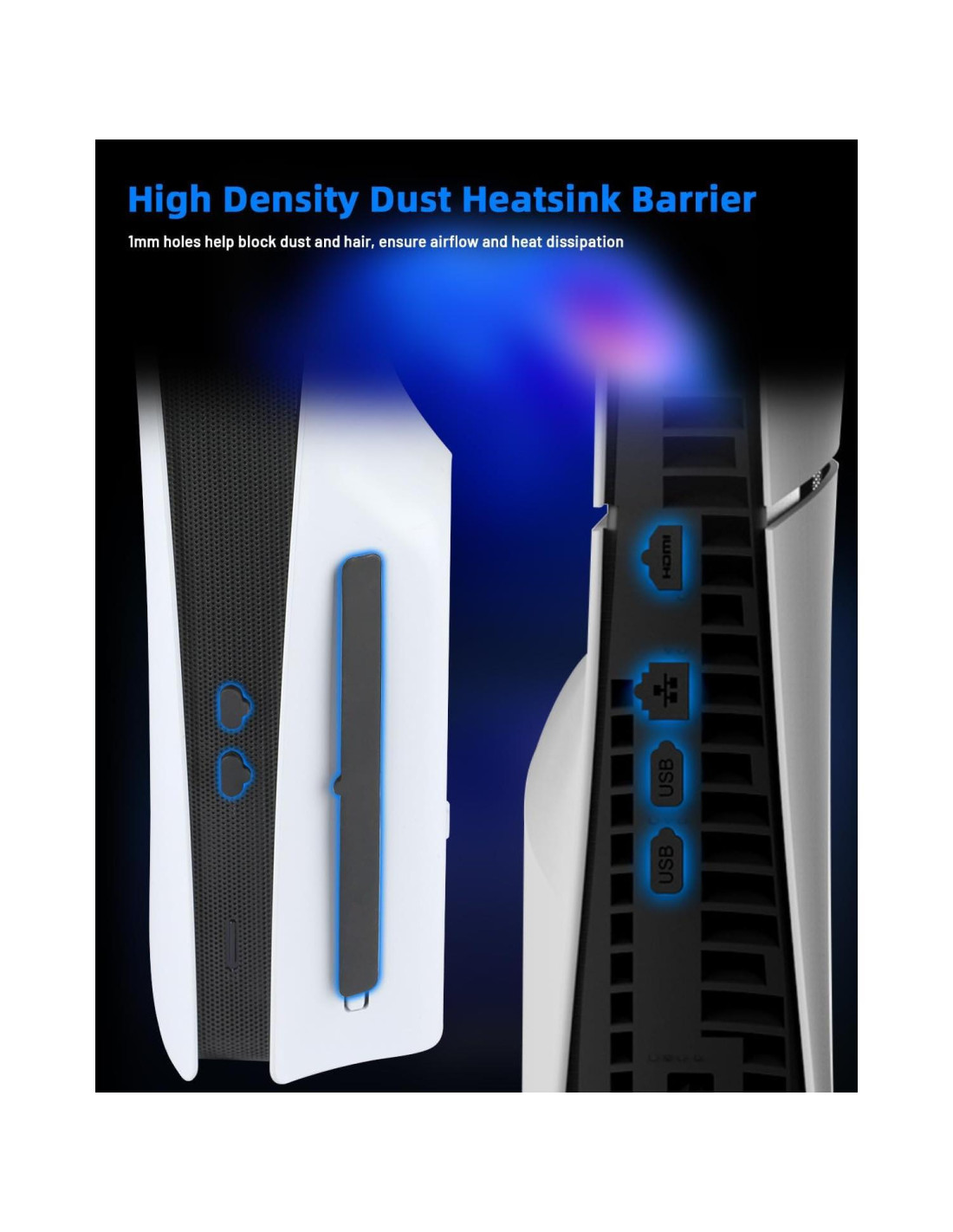 - Diseño Elegante: El protector antipolvo PS5 Slim presenta un diseño elegante que se integra perfectamente con tu consola. Está disponible para ambas versiones de la PS5 Slim, edición de disco y digital, añadiendo un toque de sofisticación a la apariencia de tu dispositivo de juego, haciéndolo más atractivo visualmente