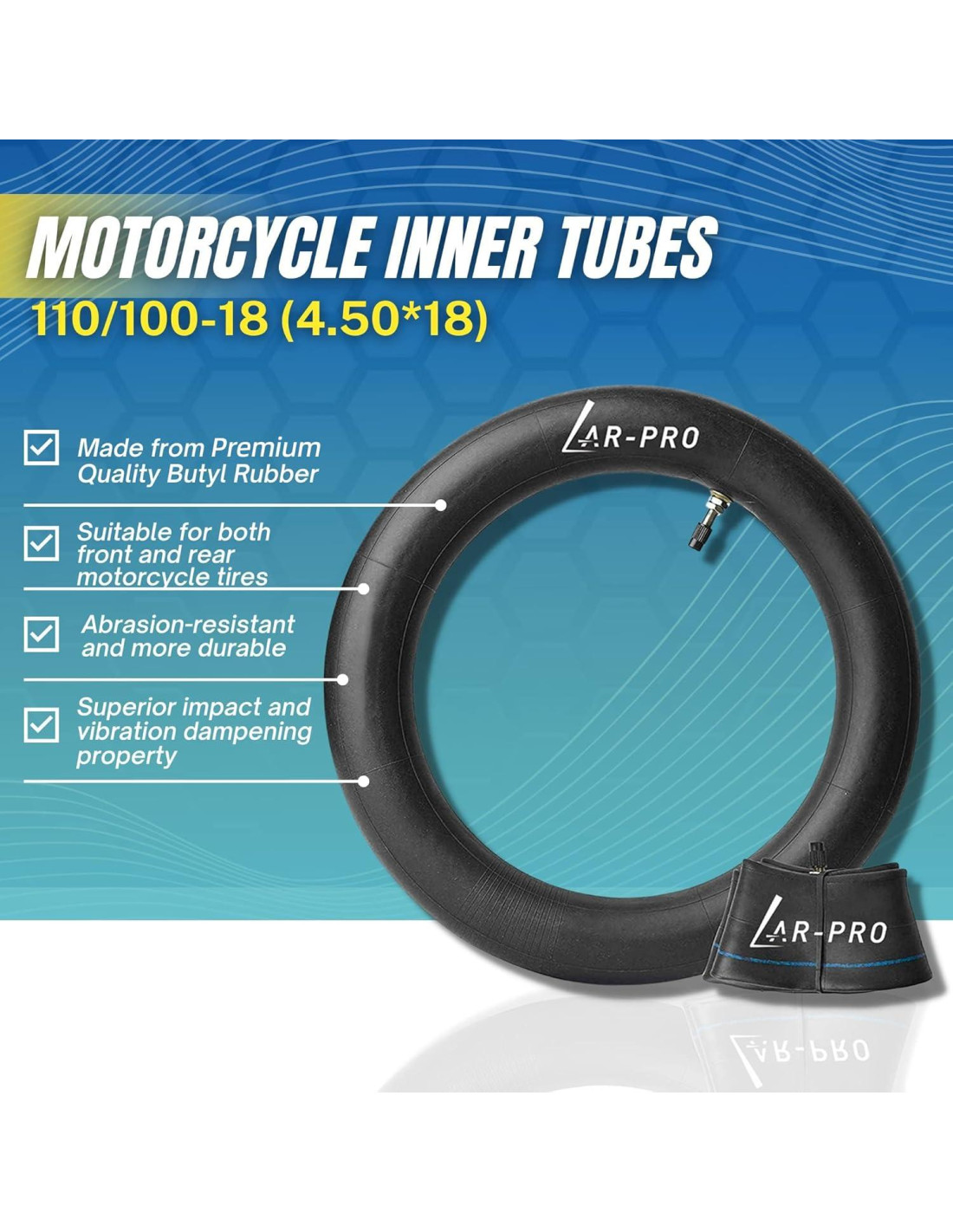 - 110/100-18 (4.50 X 18) TUBOS INTERNOS DE MOTOCICLETA DE ALTA RESISTENCIA - Estos tubos internos son adecuados para su uso en neumáticos de motocicleta que tienen un ancho de 110 mm (4.50 pulgadas) y un tamaño de llanta de 18 pulgadas. Por cada paquete, recibirás 2 tubos internos de alta resistencia.