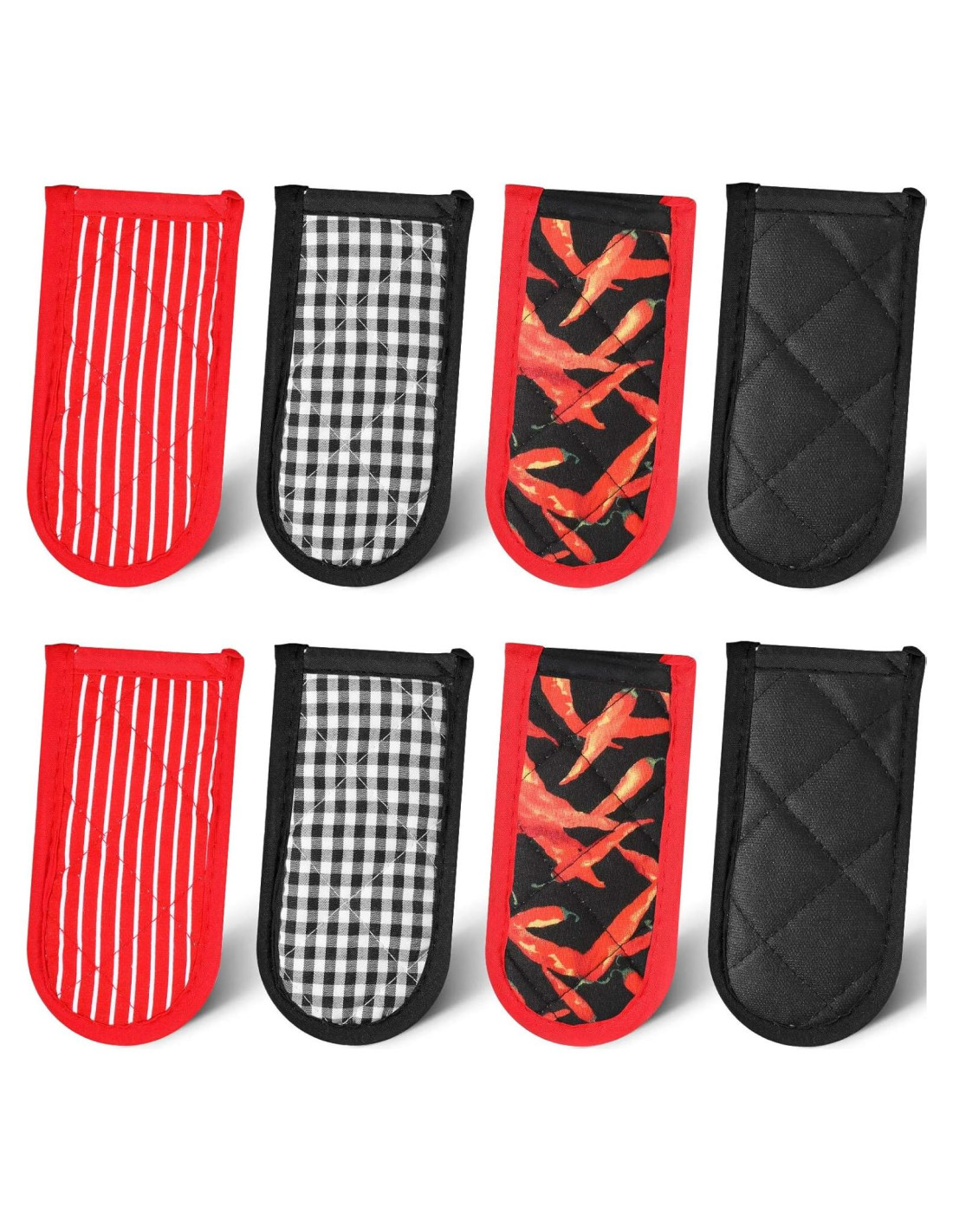 - Conjunto de estilos suficientes: 4 estilos de estos agarres de funda para olla antideslizantes para elegir, incluyen color negro sólido, cuadro de búfalo blanco y negro, color base rojo con franja blanca, base negra con diseño de pimiento rojo, puede elegir los estilos que desea para agregar un toque a los utensilios de cocina