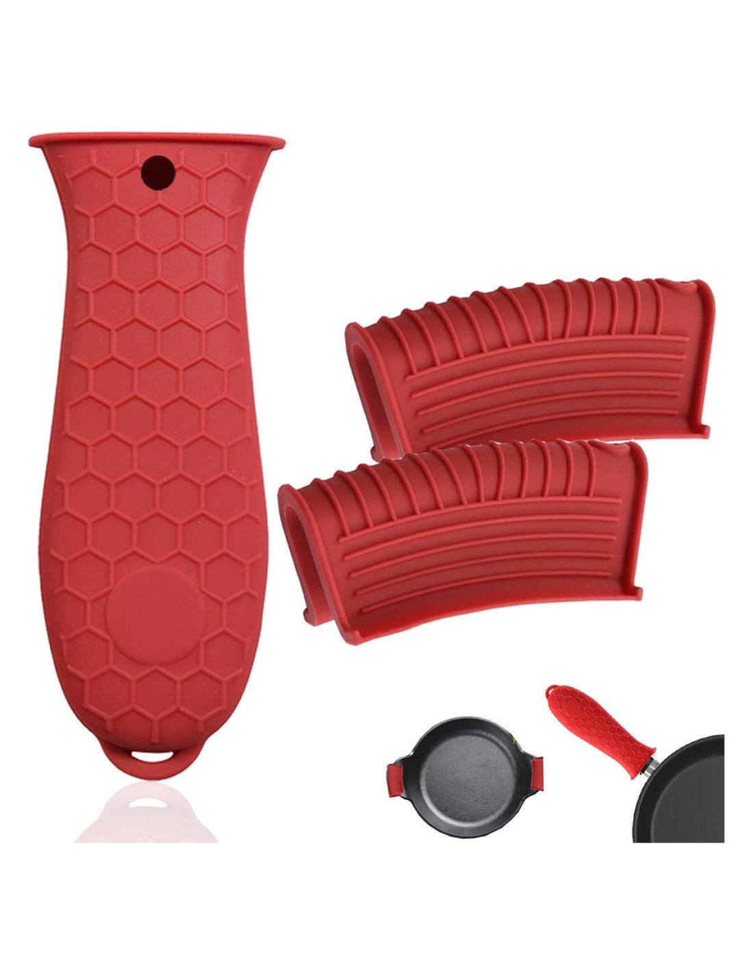 3 Pack de fundas de mango de silicona caliente, fundas de goma removibles resistentes al calor para sartenes de hierro fundido, sartenes de metal, mangos de utensilios de aluminio. Características: - Hecho de silicona resistente a altas temperaturas. - Protege tus manos de -104F a 464F (-40C a 240C). - Ofrece un agarre seguro y cómodo al manejar utensilios calientes en la estufa. - Diseño de gancho que permite colgar fácilmente y ahorra espacio. - Apto para lavavajillas. Fácil de limpiar y de secado rápido. - Textura antideslizante y ribete interno de silicona en el mango para mayor seguridad al mover sartenes pesadas y calientes, puede prevenir efectivamente caídas. - Se adapta a la mayoría de los mangos de sartenes de hierro fundido tradicionales y sartenes de doble mango. Especificaciones: Material: silicona Color: Rojo Tamaño de la funda de mango de olla: 5.31" x 2.17" (13.5 cm x 5.5 cm), tamaño de la funda de mango asistente: 3.62" x 1.57" (9.2 cm x 4 cm) Tamaño de la tapa: tamaño general. El paquete incluye: 1x Fundas de Mango de Silicona para Olla, 2x Fundas de Mango Asistente. AVISO: Confirma el tamaño de tu funda de mango de olla/sartén antes de comprar. No usar en el horno. No exponer a la luz solar directa. Se puede limpiar en la parte superior del lavavajillas. No usar la funda al entrar en contacto con llamas abiertas. No usar con temperaturas superiores a 250 grados C/475 grados F.