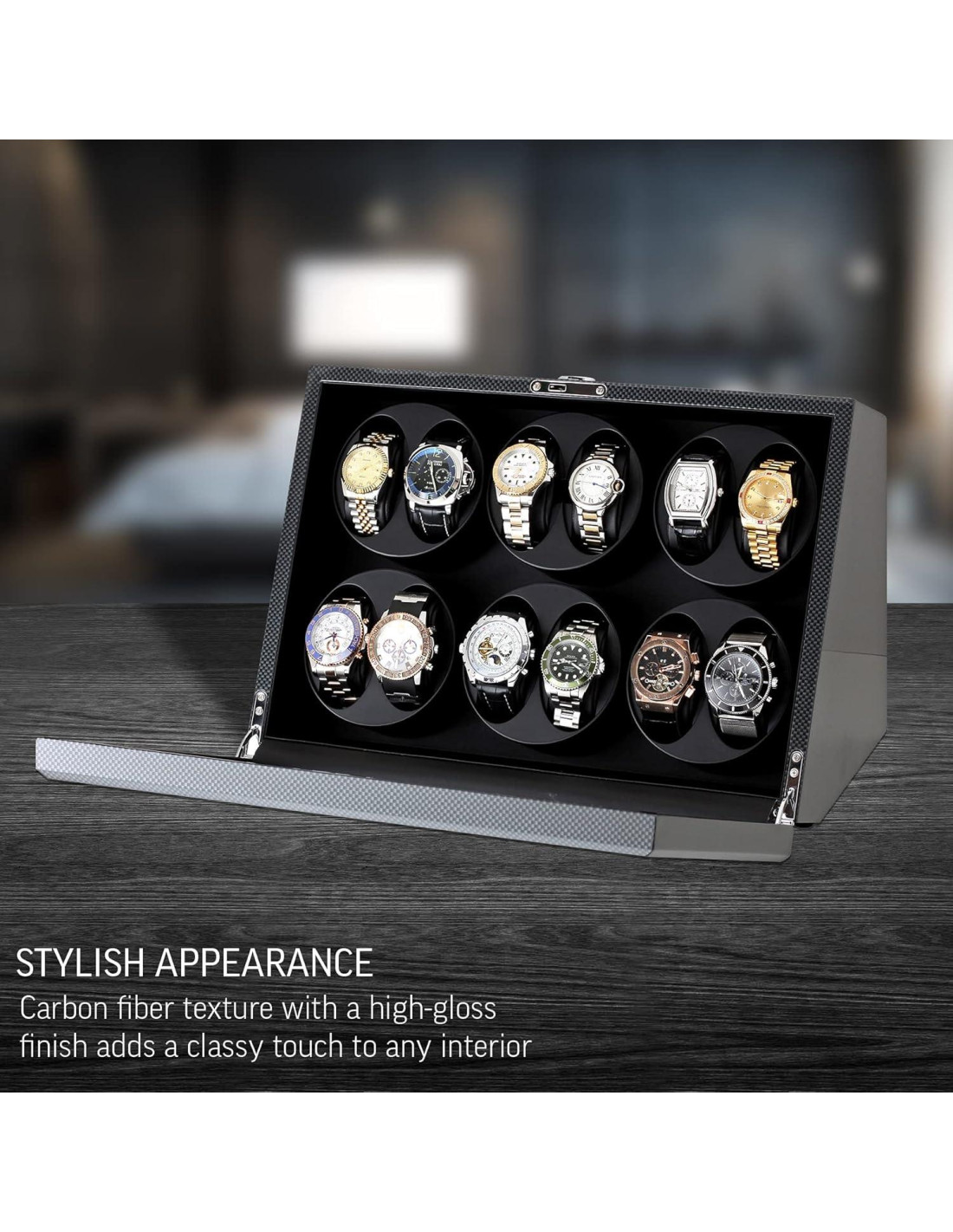 - TU COLECCIÓN COMPLETA DENTRO: 12 espacios para relojes te permiten mantener tu colección de relojes en un estuche compacto. El enrollador de relojes necesita tan solo 10"x16" (25.4 cm x 40.64 cm) en tu escritorio o tocador.