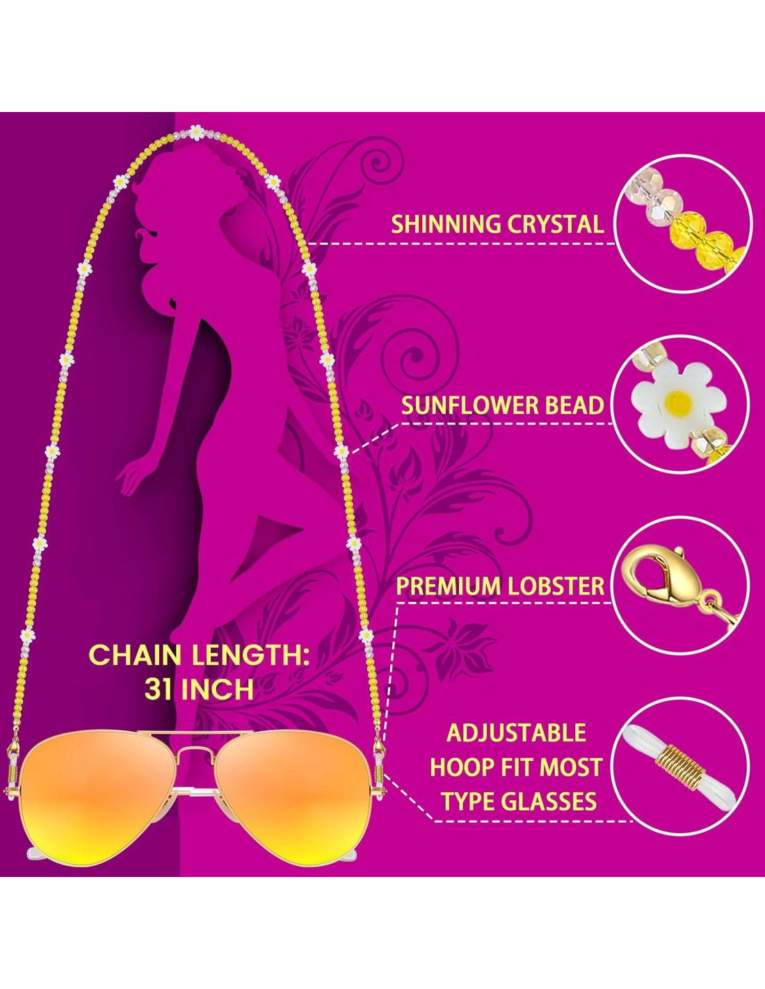 - Diseño Brillante y Elevador: Esta cadena de gafas con cristales amarillos brillantes y cuentas de girasol, los cristales amarillos no solo llaman la atención sino que también añaden una vibra alegre y elevadora a tu atuendo, nuestro diseñador se inspiró en el simbolismo del girasol, esta cadena de gafas de sol está diseñada para atraer buena suerte y energía positiva, convirtiéndola en un accesorio significativo para cualquier ocasión. Llevar la cadena 'Girasol Feliz' puede servir como un recordatorio diario para mantenerte positivo y abrazar la alegría en tu vida.