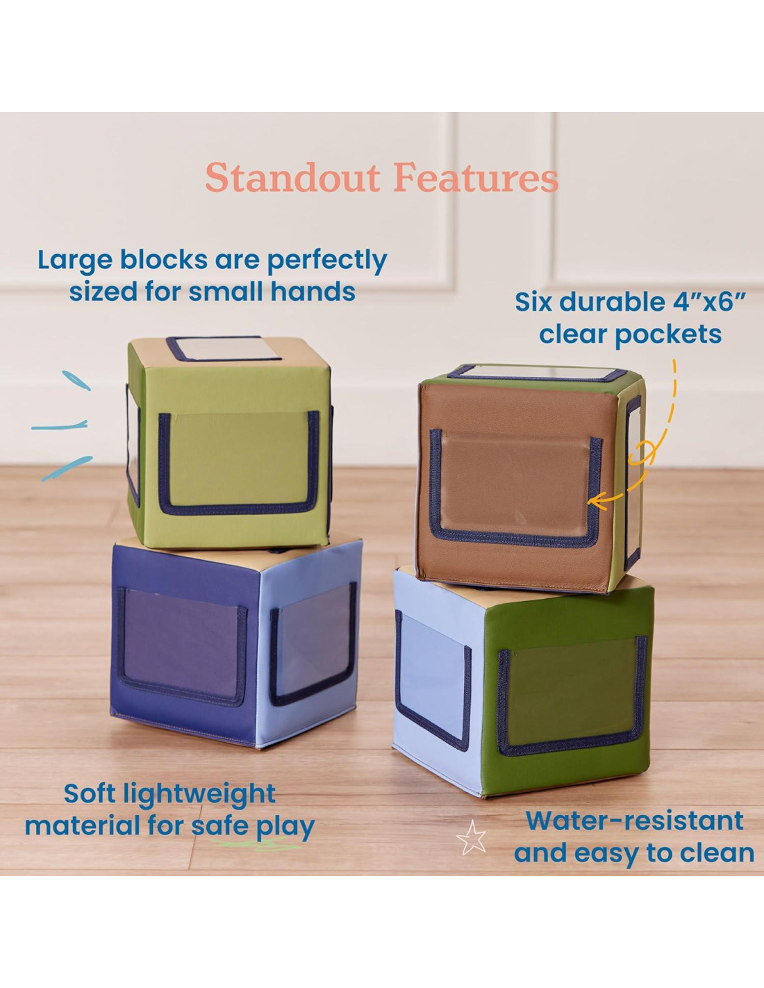 - Bloques de Actividad Personalizados: paquete de 4 bloques suaves, cada uno con seis fundas para fotos, promoviendo habilidades motoras, coordinación mano-ojo, razonamiento espacial y reconocimiento; perfectos para una sala de juegos o escuela