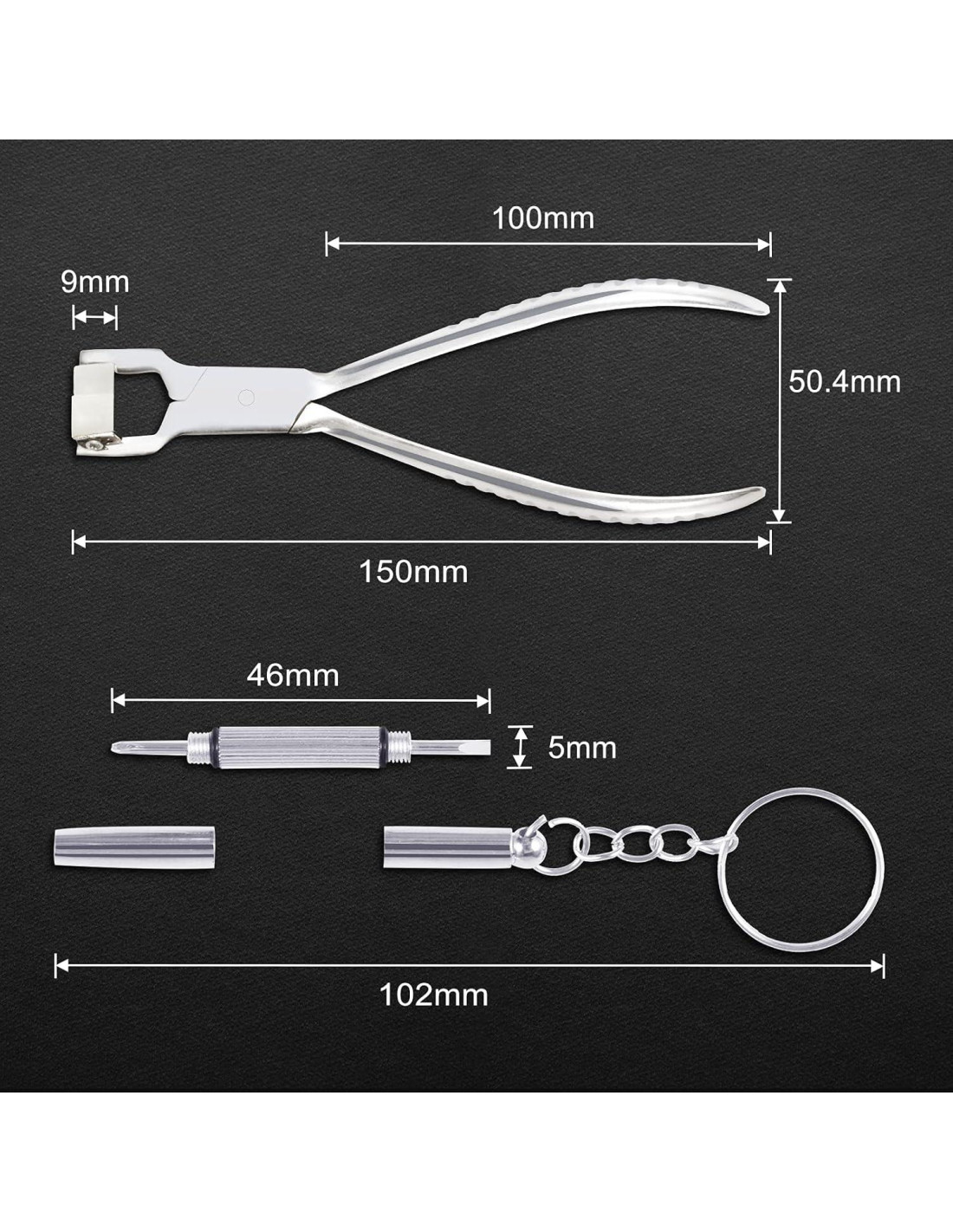 - Tamaño de los alicates: 5.9 x 2.0 x 0.6 pulgadas (14,99 x 5,08 x 1,52 cm); Tamaño del destornillador: 2.28 x 0.2 x 0.2 pulgadas (5,79 x 0,51 x 0,51 cm).
