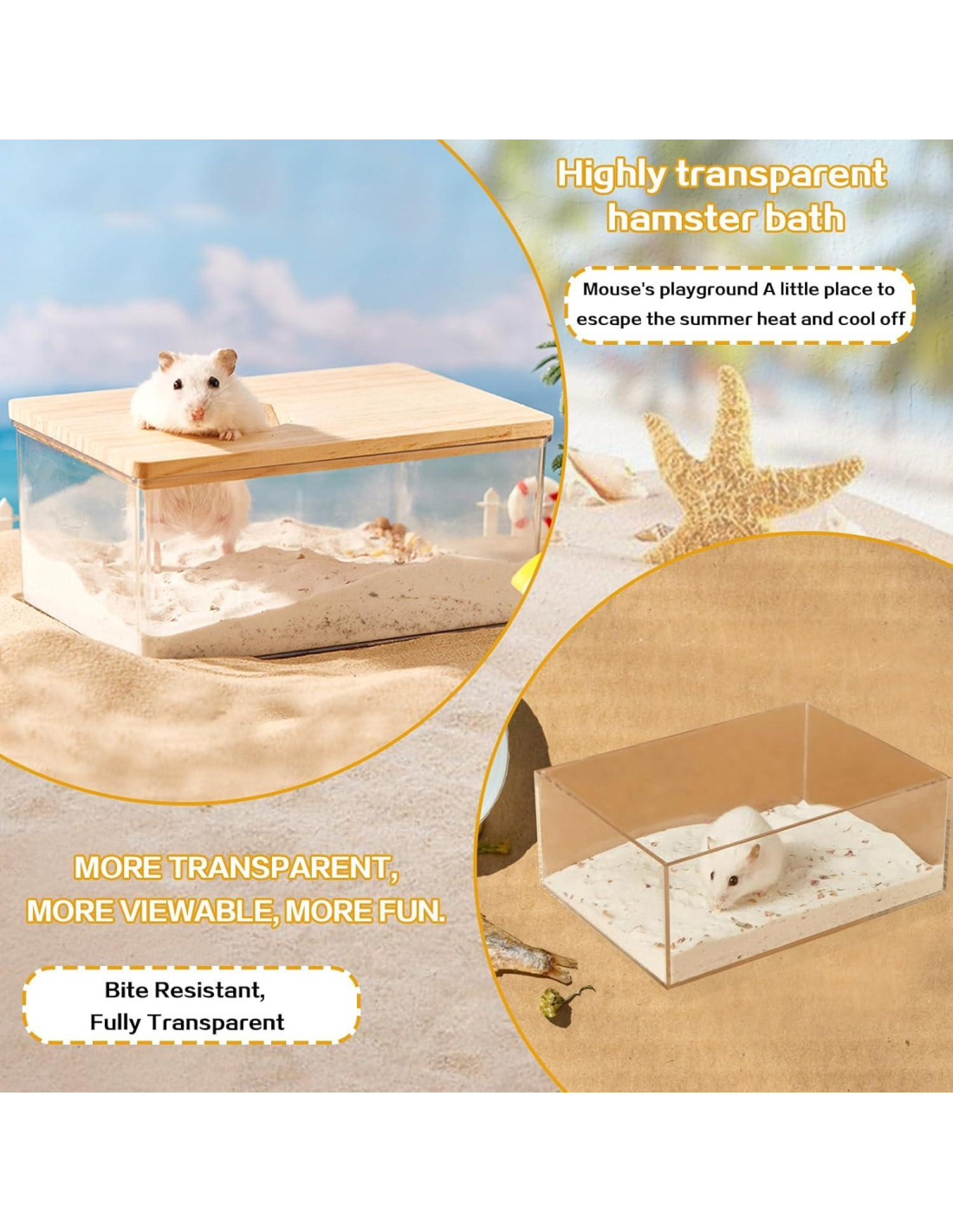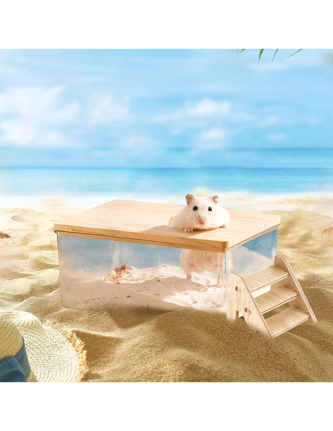 - [Cómodo y Seguro] No solo este kit de baño de arena para hámster es cómodo y seguro, su diseño avanzado también tiene en cuenta el bienestar de las mascotas. Todos los componentes del baño están firmemente sujetos entre sí, y el tabique de madera sólida natural en la parte superior mejora la estabilidad de la estructura, haciendo imposible que el hámster lo vuelque fácilmente, aumentando su seguridad.