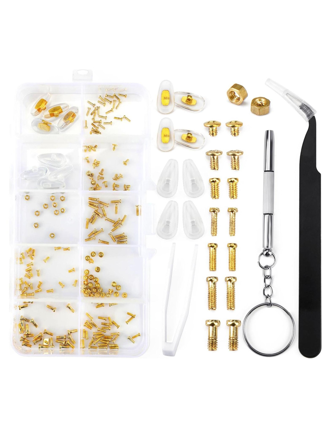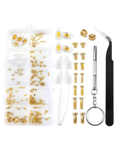 - [Kit de Reparación de Gafas Incluido] : El kit de reparación de gafas contiene 140 tornillos dorados para gafas con bolsas organizadoras de plástico, 9 tuercas, 2 pinzas, 4 pares de almohadillas nasales para gafas, 1 juego de destornilladores de precisión para gafas, 1 paño para gafas, 1 caja de almacenamiento, cumpliendo con todos los requisitos de su necesidad de reparación de gafas. Viene con 7 tamaños diferentes de pequeños tornillos para gafas dentro de 0.03"~0.2" (0,08 cm~0,51 cm). Experimentará un tipo diferente de diversión al reparar sus gafas con nuestro kit de reparación de gafas con tornillos dorados.