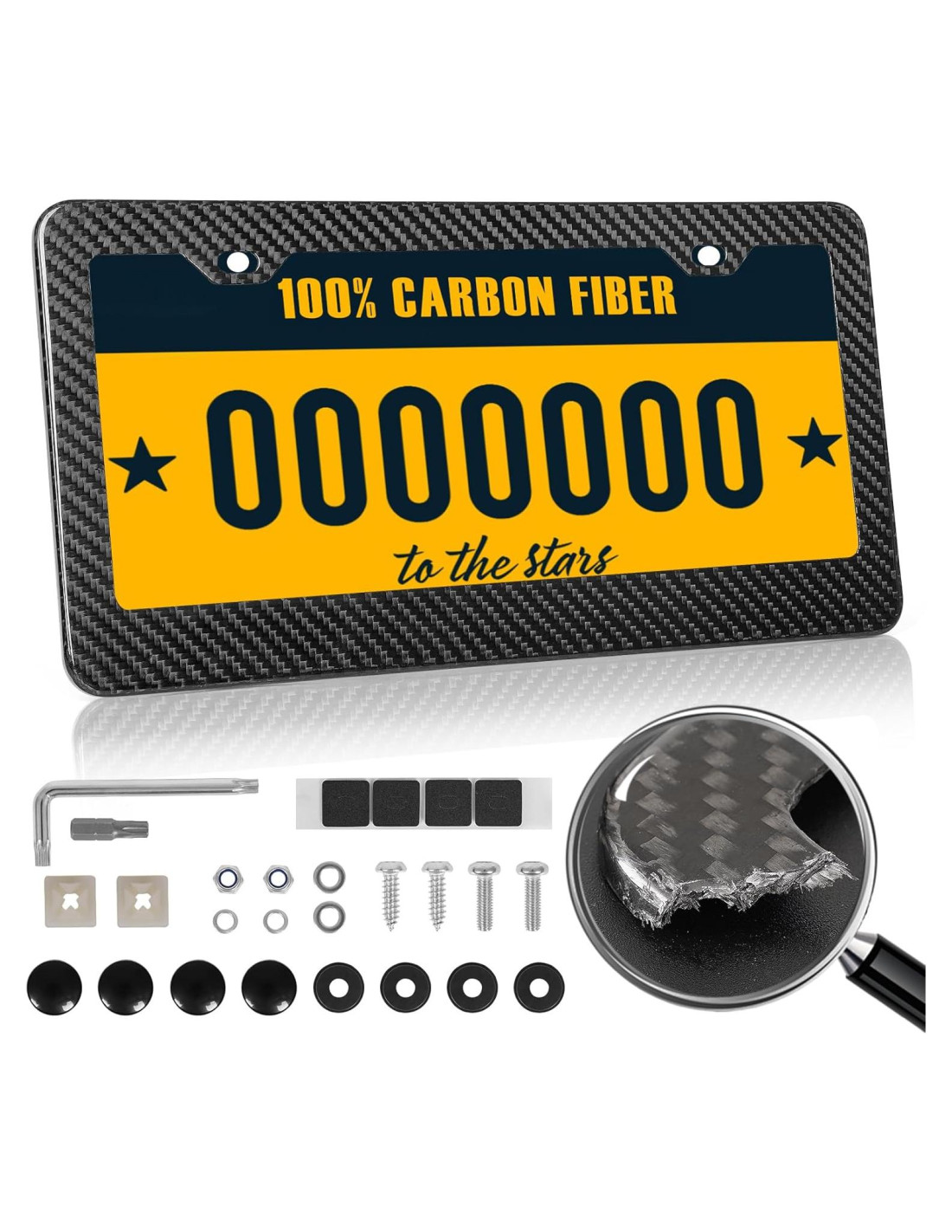 - Marco de Placa de Licencia de Fibra de Carbono 100% Real - El marco de placa de 2 agujeros está hecho de fibra de carbono seleccionada. Los marcos de placas de fibra de carbono soportan lavados de autos, óxido, corrosión y protegerán la placa de licencia. Superficie con recubrimiento brillante protector, se adapta a tu auto, las vibras elegantes fluyen naturalmente