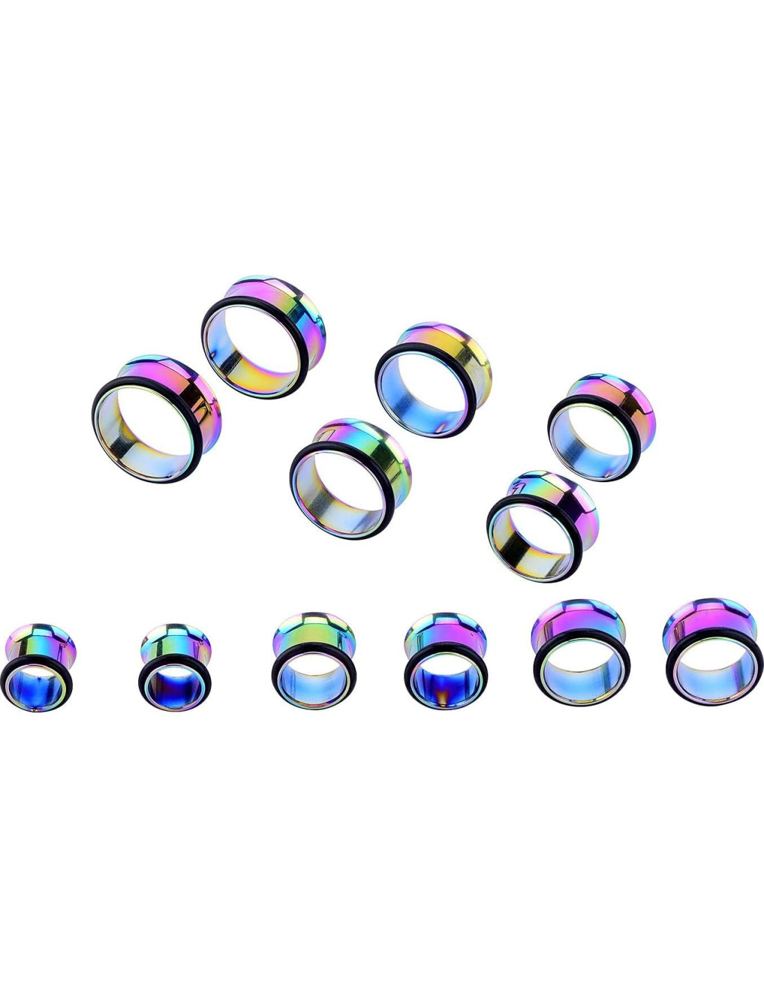 - Gran Paquete: 24 Piezas (12 Pares): 12 Piezas (6 Pares) de Tapers de Acrílico Grande y 12 Piezas (6 Pares) de Túneles de Acero Quirúrgico Grande con Anillos Dobles de Goma
