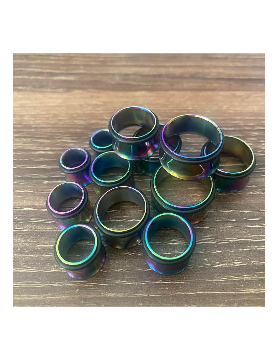 - TAMAÑOS: Tapers y Tapones (1 Par de Cada Tamaño): 00G (10mm), 1/2" (12mm), 9/16" (14mm), 5/8" (16mm), 11/16" (18mm), 13/16" (20mm). COLOR: Negro y Arcoíris