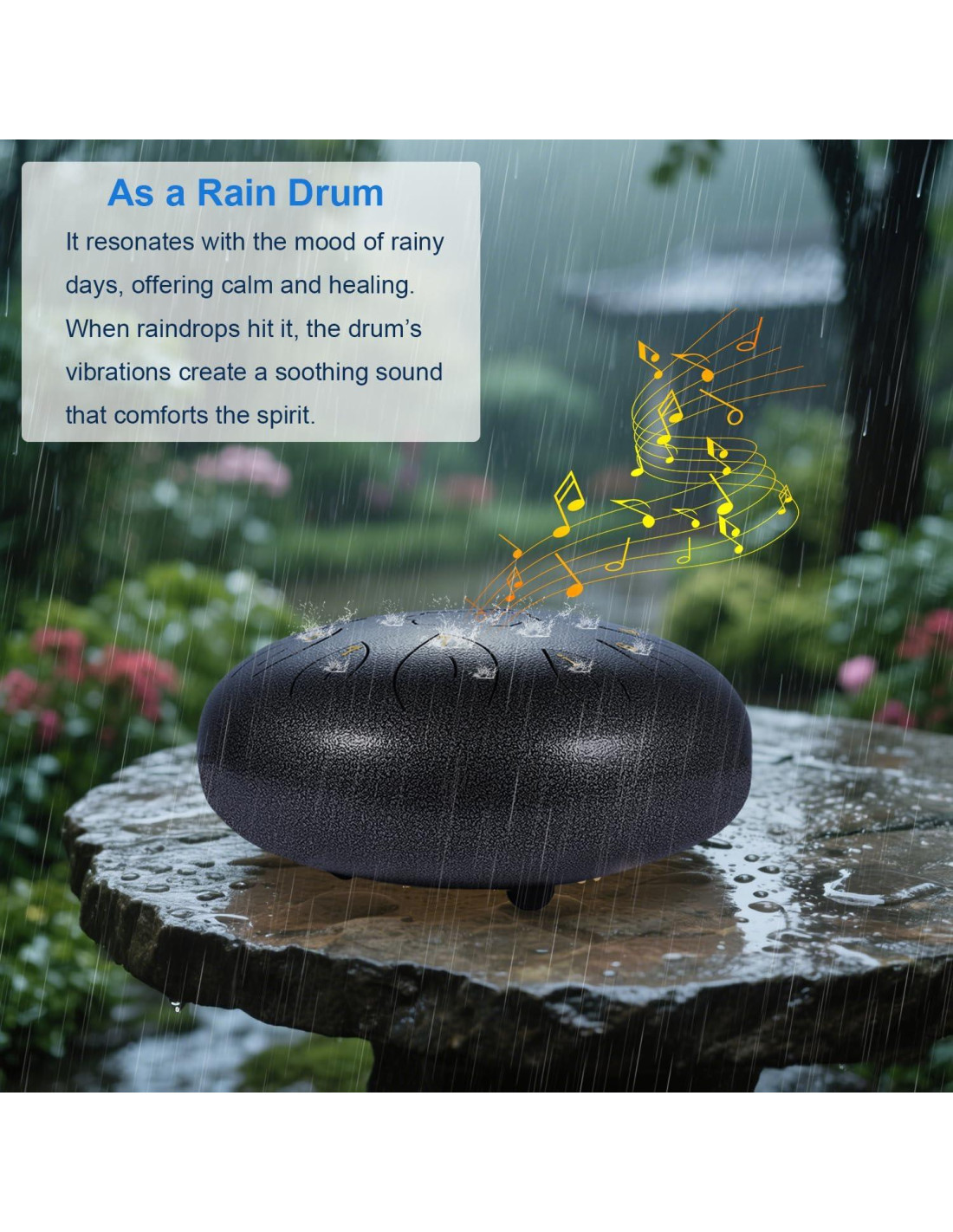 - Amplia Aplicación del Tambor de Lluvia para Exterior - El tambor de lengua es adecuado para educación musical, meditación de yoga, Zazen, actuaciones, actividades religiosas y educación fetal, etc. También es apropiado para muchas otras ocasiones, como reuniones de amigos y familiares, salidas y viajes, etc. Este tambor de acero es realmente un gran kit para tu familia, tus amigos o para ti mismo