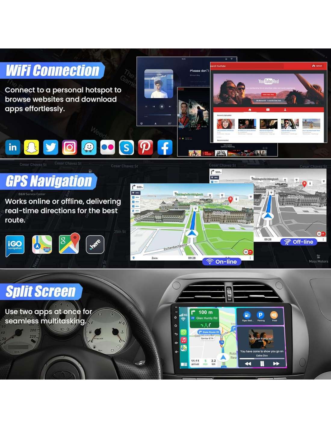 - GPS y Streaming, Dondequiera que Vaya ¡Navegue sus viajes con facilidad! Nuestra radio Toyota RAV4 viene con mapas offline integrados y WiFi para descargar nuevos mapas o transmitir videos usando aplicaciones como YouTube. Disfrute de visuales de alta definición en una rica pantalla de 9 pulgadas, haciendo que cada viaje sea agradable y atractivo, perfecto para descansos o viajes por carretera.