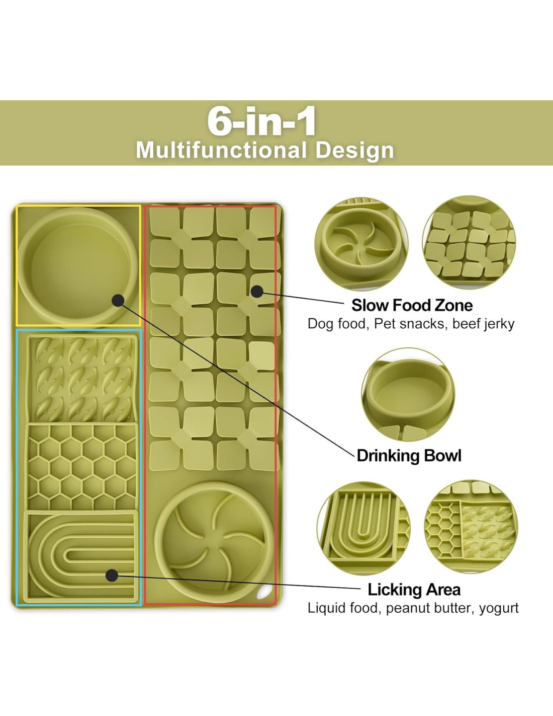 - [Diseño de Lamer Variedad 6 en 1] Esta alfombrilla para lamer está diseñada con seis zonas con diferentes funciones. 1 cuenco de agua y 2 zonas de comida lenta para comida sólida como comida para perros, carne seca, etc., y 3 zonas de lamer diferentes para diferentes alimentos líquidos como yogur, mantequilla de maní, etc. Diseñada con estos diseños para reducir la velocidad de alimentación de tu perro y proporcionarle una experiencia de lamido más atractiva y satisfactoria.