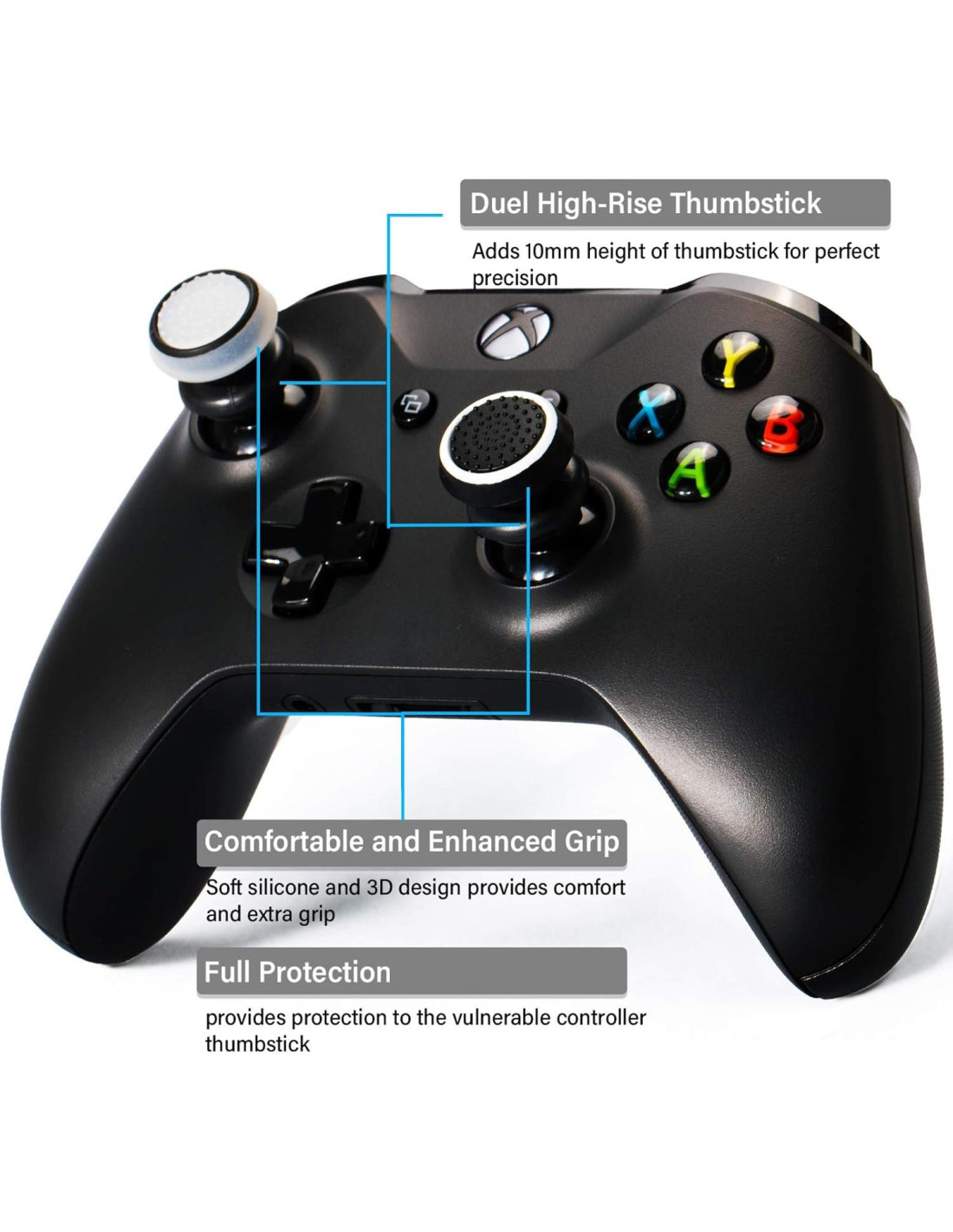 Los juegos de Extensor de Thumbstick y Cubierta de Agarre de Silicona de Playrealm no solo proporcionan más precisión en los juegos de disparos en primera persona, sino también un mejor control y comodidad en juegos de carreras y acción. La altura adicional con el extensor instalado aumenta el rango de movimiento del stick para un mismo ángulo, lo que facilita mucho realizar una puntería, giro y movimiento precisos. Los suaves agarres de silicona también ofrecen comodidad y protección ideales. Encontrarás todo bajo control en cualquier juego con los juegos de Playrealm. Compatibilidad: Se adapta a los controladores oficiales de Xbox Series X (XSX), Xbox Series S (XSS), Xbox One, Xbox S, Xbox X, NO se adapta al controlador Elite ni a ningún controlador de terceros; Material: Extensores de Thumbstick: Plástico/PC Agarre de Thumb: Silicona Contenido del paquete: Extensor de Thumbstick x 2 Agarre de Thumb x 2 Aviso: Los controladores no están incluidos; Por favor, limpia los agarres de thumb con un paño o tissue antes de usar para un mejor rendimiento; Mantén los juegos alejados de bebés menores de 3 años; Mantén los juegos alejados de fuentes de calor y ácidos. 1 año de garantía, cualquier problema por favor contáctanos.
