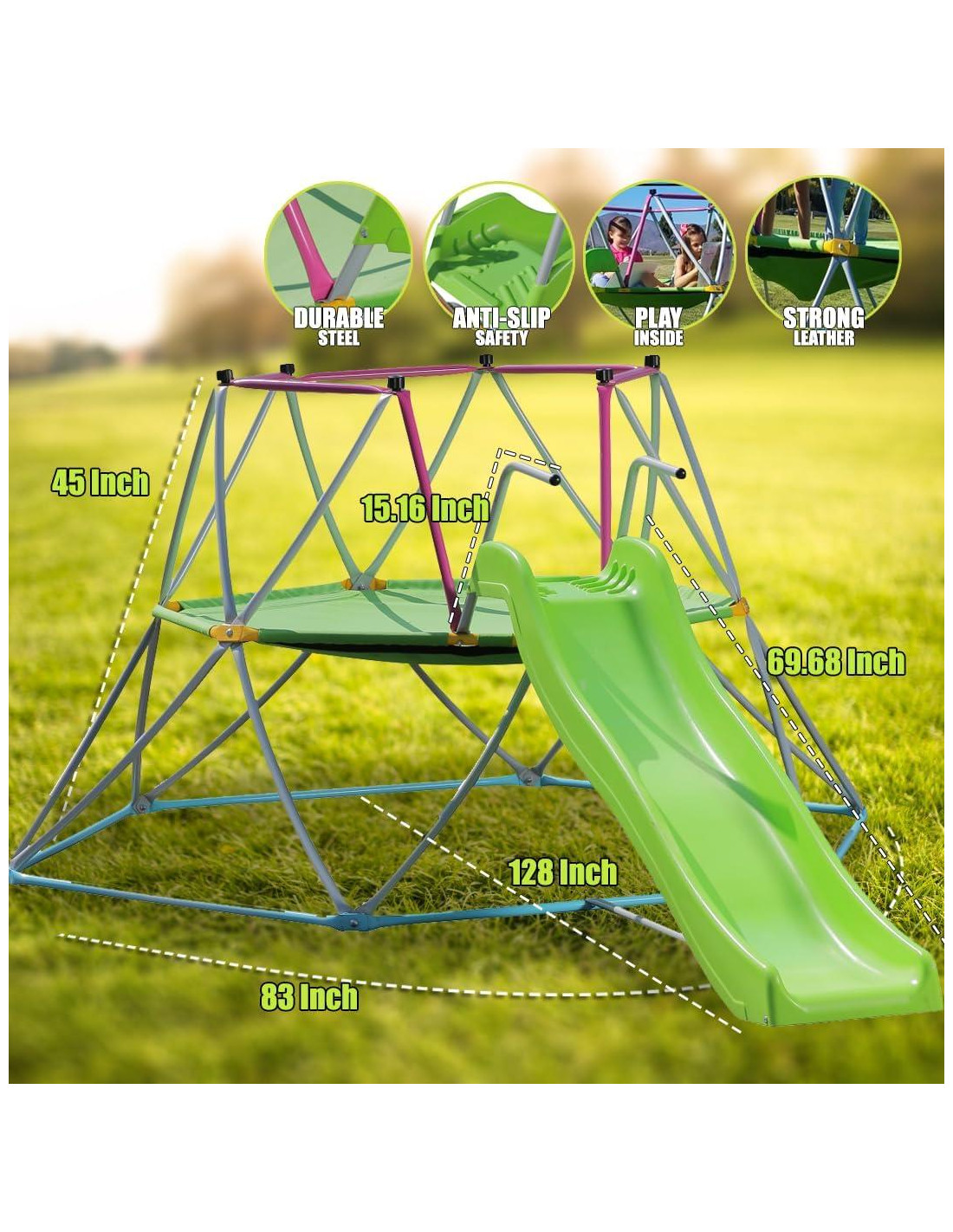 - Duradero: La construcción de acero recubierto en polvo de alta resistencia en un marco geométrico innovador soporta hasta 158.8 kilogramos. Varios niños pueden participar fácilmente en juegos sociales mientras desarrollan confianza, músculos más fuertes y mayor agilidad. Con un acabado resistente a la intemperie y al óxido, este centro de actividades/gimnasio de escalador en cúpula durará a tus hijos durante años.