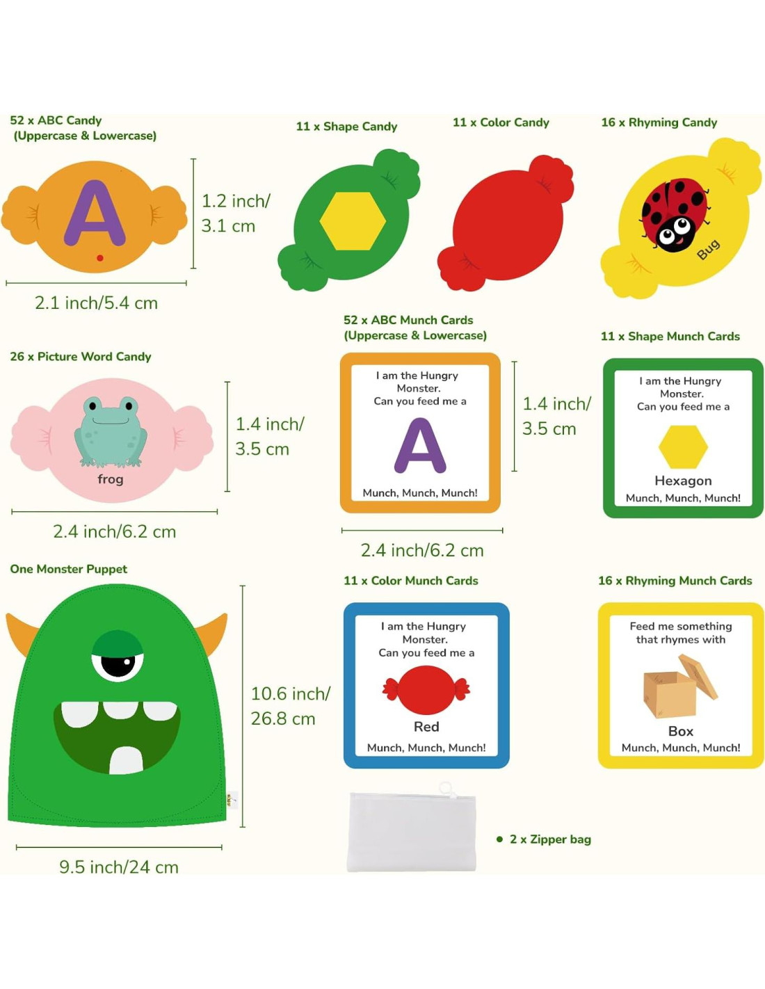 - Qué recibirás: Recibirás un pequeño monstruo que come caramelos y presenta letras mayúsculas y minúsculas cuadradas. Incluye emparejamiento de letras mayúsculas y minúsculas, colores, formas y juegos de ortografía relacionados con conocimientos básicos de la vida (como animales pequeños, expresiones, etc. Este es un producto de educación temprana muy interesante que combina aprendizaje y entretenimiento.