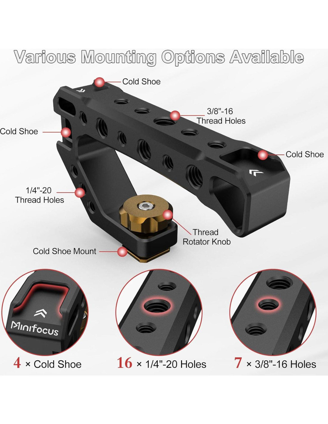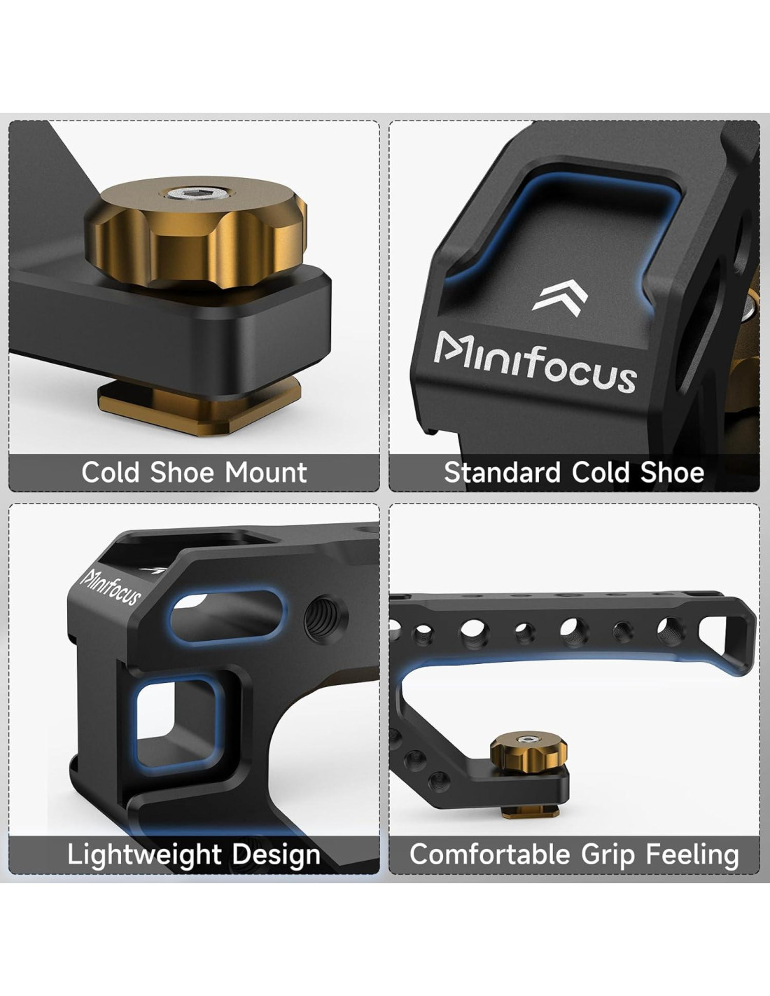 - Extensión de zapata fría integrada: Equipado con 4 monturas de zapata fría, permite la conexión simultánea de múltiples accesorios, incluyendo monitor, micrófono, luz LED y otros accesorios; Adaptadores de montura de zapata fría con diseño de desplazamiento para evitar interferencias.