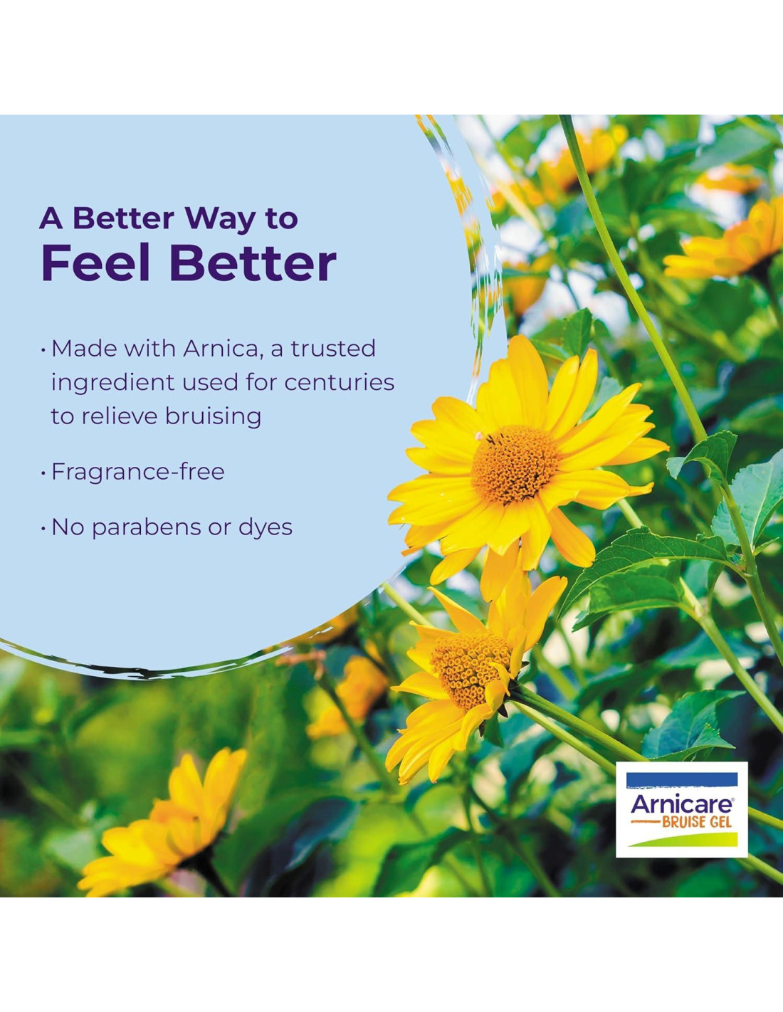 Gel Arnicare para moretones 42.5 g Usos Reduce el dolor, la hinchazón y la decoloración de los moretones Ingredientes activos Arnica montana 1X HPUS-7% Trauma, dolor muscular y rigidez, hinchazón por lesiones, decoloración por moretones Ingredientes activos Ingredientes inactivos Alcohol Carbómero Agua purificada Hidróxido de sodio agua purificada hidróxido de sodio Gel de rápida absorción No graso Sin fragancia Libre de parabenos Instrucciones Aplicar una capa delgada de Arnicare Bruise en el área afectada y masajear suavemente tan pronto como sea posible después de un moretón menor. Repetir 3 veces al día o según sea necesario. Advertencias: Mantener fuera del alcance de los niños. Al igual que con todos los suplementos dietéticos, consulte a su profesional de salud antes de usar. Consulte la etiqueta del producto para más información. Solo para uso externo. Evitar el contacto con los ojos, membranas mucosas, piel dañada o heridas. No usar si es alérgico a Arnica montana o a cualquiera de los ingredientes inactivos de este producto. Al usar este producto, usar solo según las indicaciones, no vendar de manera ajustada ni usar una almohadilla térmica. Suspenda el uso y consulte a un médico si la condición persiste por más de 3 días o empeora. Mantener fuera del alcance de los niños. Si se ingiere, busque ayuda médica o comuníquese con un centro de control de intoxicaciones de inmediato.