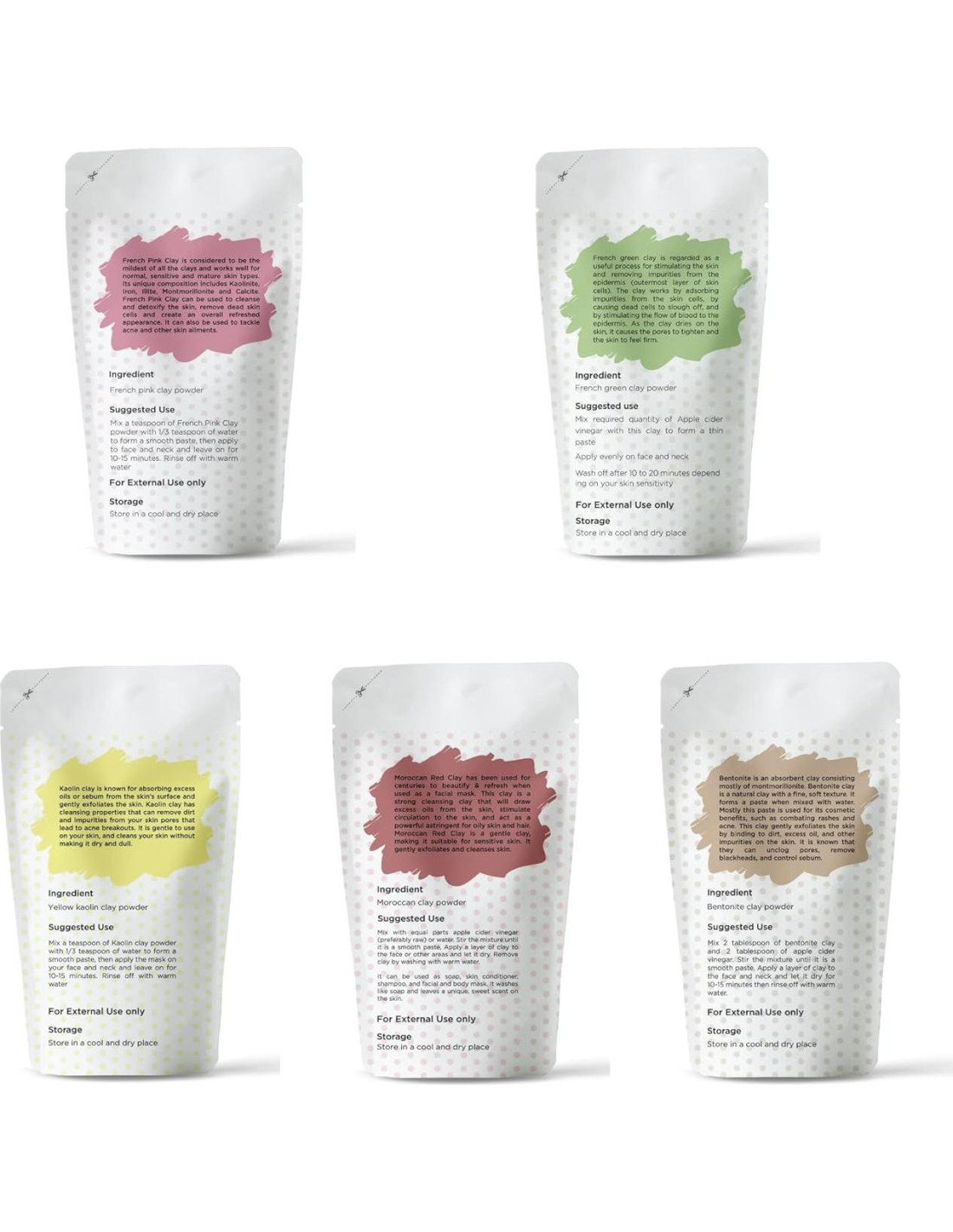 Descripción del Producto : Arcilla Rosa / Rosa : La arcilla rosa es una de las arcillas más suaves. Por lo tanto, se utiliza principalmente en la preparación de jabones y máscaras faciales caseras. Ayuda a proporcionar una textura y color suaves y reconfortantes en el uso de jabones y máscaras caseras. Arcilla verde francesa : Tiene una textura fina y se utiliza comúnmente para la absorción de color y aceite en máscaras faciales. El color verde claro proviene de materia vegetal descompuesta. Es más adecuada para tipos de piel grasa. Arcilla de caolín : El caolín es una de las arcillas más suaves y puras. La textura muy fina y absorbente limpia suavemente, exfolia y elimina los poros obstruidos, mientras mejora la circulación. El polvo de caolín es calmante, limpiador e hidratante. Cuando se usa en jabones proporciona una espuma cremosa suave. Arcilla roja marroquí : La arcilla roja marroquí se ha utilizado durante siglos para embellecer y refrescar cuando se usa como máscara facial. Este polvo de arcilla roja marroquí es una arcilla limpiadora fuerte que extraerá el exceso de aceites de la piel, estimulará la circulación en la piel y actuará como un poderoso astringente para piel y cabello grasos. La arcilla roja marroquí es una arcilla suave, lo que la hace adecuada para pieles sensibles. Exfolia y limpia suavemente la piel. Arcilla bentonita : La bentonita es una arcilla absorbente que consiste principalmente en montmorillonita. Forma una pasta cuando se mezcla con agua. Principalmente, esta pasta se utiliza por sus beneficios cosméticos, como combatir erupciones y acné. Esta arcilla exfolia suavemente la piel al unirse a la suciedad, el exceso de aceite y otras impurezas en la piel. Se sabe que pueden desobstruir poros, eliminar puntos negros y controlar el sebo.