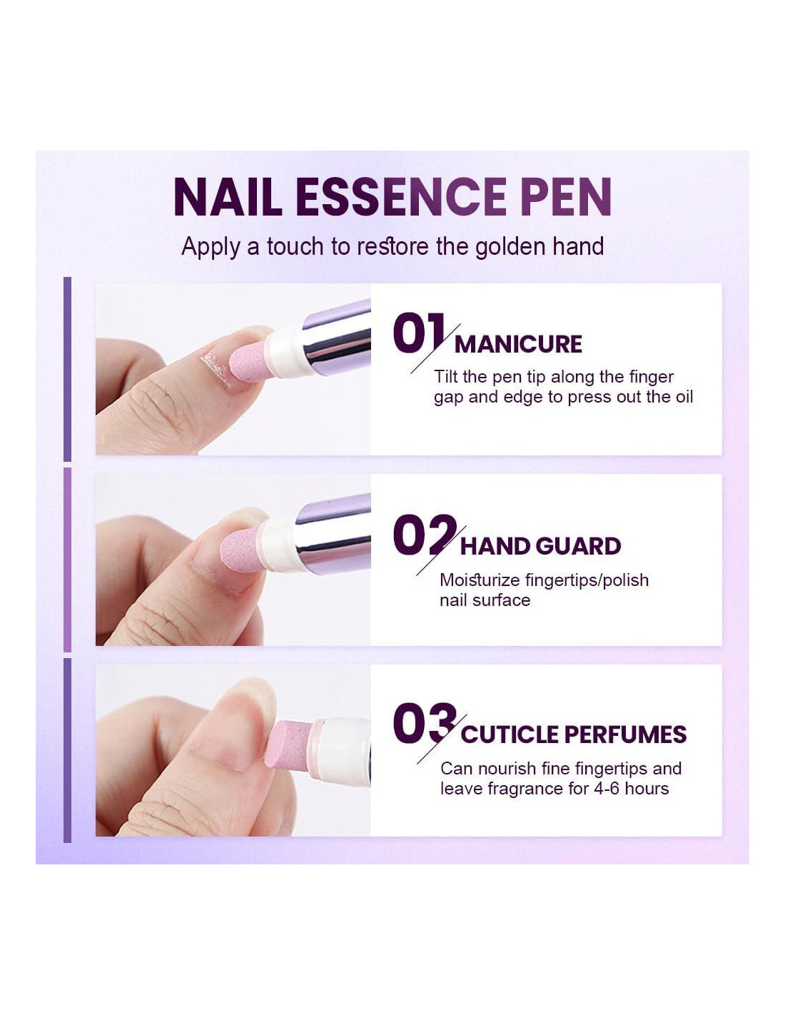 - Cuidado de Uñas 3-en-1: El Bolígrafo de Cuidado de Uñas 3-en-1 combina un removedor de cutículas, un bolígrafo pulidor de uñas y un bolígrafo empujador de cutículas en una herramienta conveniente, facilitando más que nunca lograr uñas saludables y brillantes. Este diseño innovador hidrata, repara y da brillo a tus uñas, transformando superficies secas y ásperas en una hermosa perfección
