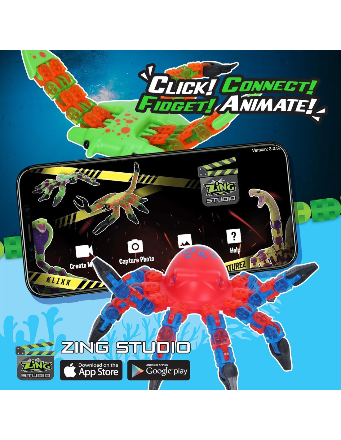 - ANIMACIÓN STOP MOTION: Con múltiples articulaciones y enlaces, puedes crear tus propias animaciones stop-motion con la aplicación Zing Studio (disponible en Google Play y App Store). Usa tu imaginación para crear películas de aventuras protagonizadas por las Criaturas Klixx.