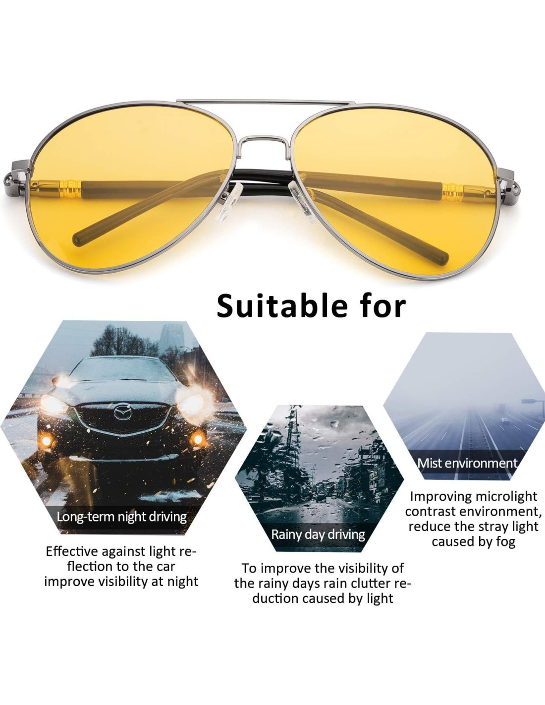 - LENTE AMARILLO DE VISIÓN NOCTURNA --- Gafas para conducir antideslumbrantes con protección UV400 completa lente amarilla. 100% protección UVA y UVB que permite ver mejor al conducir de noche o en días nublados, brumosos o lluviosos, haciendo que la conducción y todas las actividades al aire libre sean más seguras. Lentes de alta definición que te brindan una visión natural y clara; resistentes y a prueba de roturas.