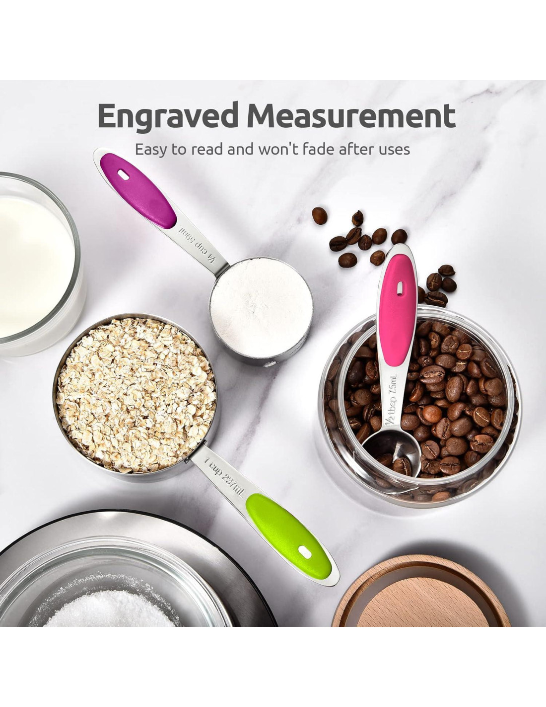 - [La medida grabada nunca se borrará] Si te molesta la medida pintada (fácil de desvanecer) como señala el 16.29% de las personas, puedes elegir nuestras medidas métricas grabadas que son fáciles de leer y no se borrarán. Para asegurar una medición precisa en la cocina/hornado, este juego de tazas medidoras incluye 1/8 taza, 1/4 taza, 1/3 taza, 1/2 taza, 1 taza y 1/4 cucharadita, 1/2 cucharadita, 1 cucharadita, 1/2 cucharada, 1 cucharada.