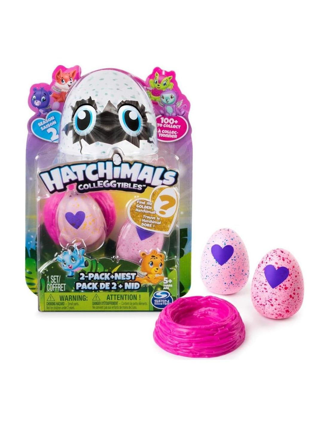 Conoce todos los nuevos hatchimals coleccionables de la temporada 2! Dentro de este 2-Pack hay dos huevos mágicos y un accesorio de nido. ¡El lugar perfecto para jugar y exhibir! Comienza a incubar calentando cada huevo hasta que el corazón morado se vuelva rosa. ¡Presiona hacia abajo para romper la cáscara y conocer a tu pequeño Hatchimal! Con más de 100 adorables criaturas para coleccionar, ¡puedes encontrar hatchimals de la jungla, el jardín y más! ¡Incluso puedes descubrir el Hatchimal dorado! Usa el mapa del coleccionista para averiguar de dónde vienen tus hatchimals. Para un póster completo de hatchtopia, encuentra los 4 mapas de coleccionista (1 incluido). ¿A quién incubarás?