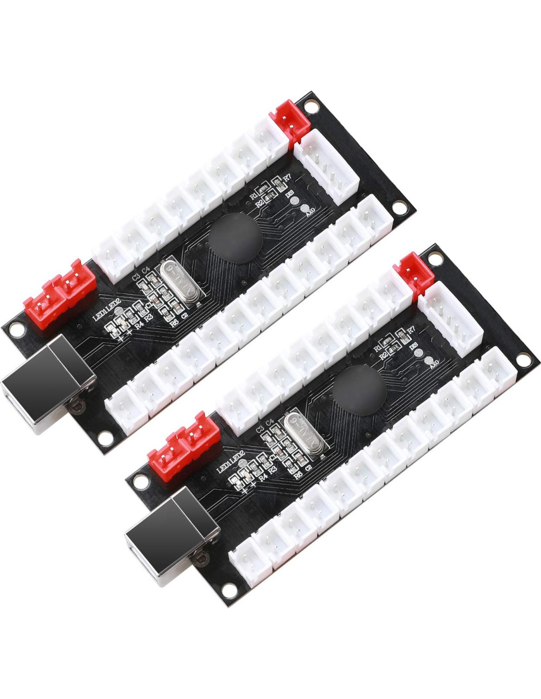 Controlador de Juego Genérico USB para 2 Jugadores Sin Retraso para MAME y Raspberry Pi 1/2/3 Proyectos DIY Soporte para Piezas SANWA 1: Codificador USB Sin Retraso para Proyectos DIY de Juegos de Arcade para 2 Jugadores. 2: Soporte para Raspberry Pi, PC, Windows, Arcade1Up, Mac, Ampliamente utilizado para Proyectos DIY de Consolas de Juegos de Arcade. 3: Terminal de Cable es JST XH2.54 a 0.110 Pulgadas (2.8mm) terminal de tamaño 2.8mm para botones pulsadores. Joysticks y Botones Pulsadores de Estilo SANWA se adaptan perfectamente a este conjunto. 4: Construye tu propia Máquina de Juegos de Arcade. Diseño de Instalación Súper Fácil. 5: Diseño de Salida de 3 x 5V. No Necesita Fuentes de Poder Adicionales para Joysticks LED / Cadena de Luz LED / Botones de Arcade LED. Un Kit de Controlador USB de Arcade para 2 Jugadores. Solo necesitas agregar cantidad si deseas construir una Máquina de Juegos de Arcade para Múltiples Jugadores. ¿Qué hay dentro del paquete? 2 x Cables USB de 70 Pulgadas (1.78 metros). 2 x Placa de codificador de alta calidad. 2 x Cable de 5 pines para Joystick (Se adapta perfectamente a Joysticks de Tipo de 5 Pines). 20 x Cables para Botones. (El tamaño de este cable es perfecto para Botones Pulsadores Sanwa).