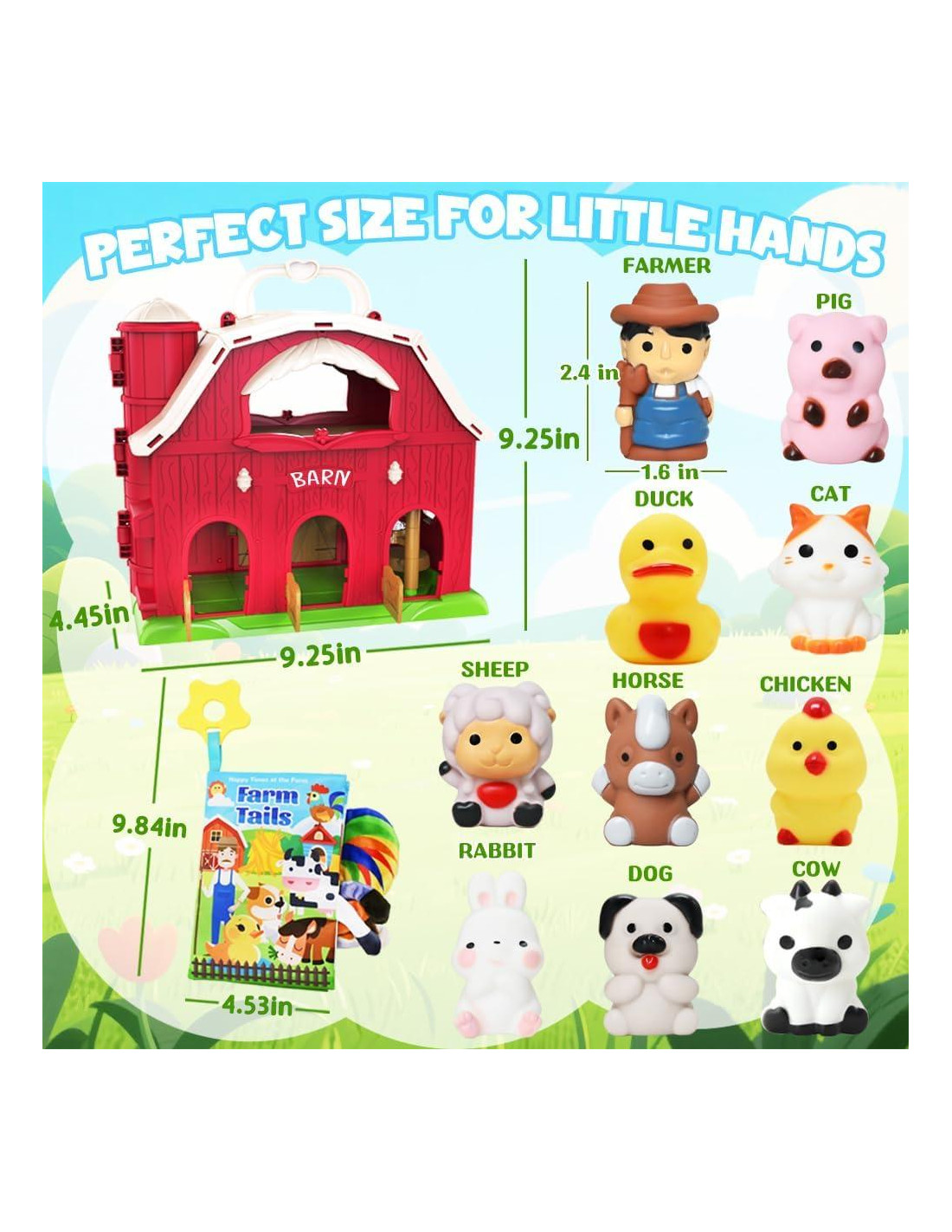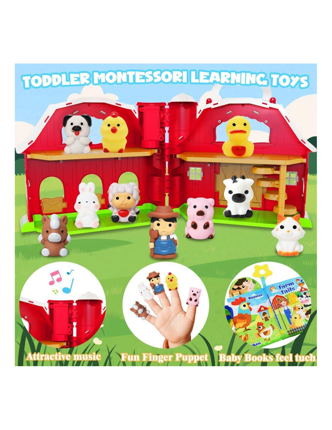 - Diversión Musical: Este encantador juego educativo de granja incluye un granero rojo con una función musical encantadora, un libro para bebés, un granjero y 9 adorables animales de granja (vaca, caballo, cerdo, burro, oveja, conejo, ganso, gallina y pato) que inspiran narraciones imaginativas y aventuras.