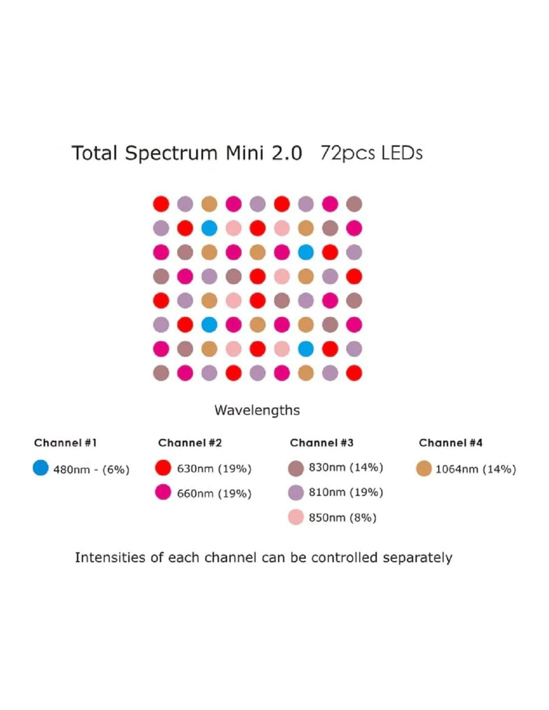 MINI ESPECTRO TOTAL - 7 LONGITUDES DE OLA 72 LEDS PARA CUERPO COMPLETO El Mini Espectro Total cuenta con 7 longitudes de onda investigadas a fondo a partir de más de 2600 estudios clínicos humanos con mayores densidades de LED: 480nm (6%), 633nm (19%), 660nm (19%), 810nm (19%), 830nm (14%), 850nm (8%) y 1064nm (14%). Experimenta el poder de la terapia dirigida de luz roja y cercana al infrarrojo con el Mini Espectro Total, diseñado para apoyar la salud de la piel, el antienvejecimiento, el alivio del dolor profundo, la reducción de la inflamación, la mejora del sueño, la salud cerebral, el metabolismo de grasas y la recuperación muscular. Con 7 longitudes de onda meticulosamente investigadas derivadas de más de 2,600 estudios clínicos humanos, este panel LED de alta densidad asegura beneficios terapéuticos óptimos: 480nm (6%) - Rejuvenecimiento de la piel y beneficios de la luz azul 633nm (19%) - Producción de colágeno y antienvejecimiento 660nm (19%) - Penetración profunda en la piel y regeneración celular 810nm (19%) - Función cognitiva y salud neurológica 830nm (14%) - Alivio del dolor y circulación mejorada 850nm (8%) - Reparación de tejidos profundos y reducción de la inflamación 1064nm (14%) - Recuperación muscular y metabolismo de grasas Certificados CE: Tenemos dos certificados CE para nuestras luces LED. Estos certificados confirman: Cumplimiento con la Directiva Europea de Baja Tensión, asegurando la seguridad eléctrica del producto. Cumplimiento con la Directiva de Compatibilidad Electromagnética, asegurando que el producto no interfiera con otros dispositivos electrónicos ni cause perturbaciones electromagnéticas. Certificado RoHS: RoHS significa Restricción de Sustancias Peligrosas. Esta certificación asegura que nuestros productos tienen materiales peligrosos limitados o nulos que son dañinos para el medio ambiente y los usuarios. Cumplimiento FCC: Nuestras luces LED están certificadas por la FCC, lo que significa que cumplen con las regulaciones de la Comisión Federal de Comunicaciones (FCC) para interferencia electromagnética. Esto asegura que operen de manera segura sin interrumpir otros dispositivos electrónicos, haciéndolos adecuados para su uso en hogares y entornos comerciales. CARACTERÍSTICAS: v Garantía de 3 años v Material: Aluminio v Voltaje: AC100-240V v 7 Modos de Rendimiento v Ángulo de Haz de 30 Grados v Líder del Mercado en Irradiancia v Vida útil de LED: 100,000 horas v Modos de rendimiento preconstruidos: 7 v Registrado por la FDA y Certificado CE, RoHS v 172mW/cm2 a 8 pulgadas (20,32 cm) usando un medidor de energía solar