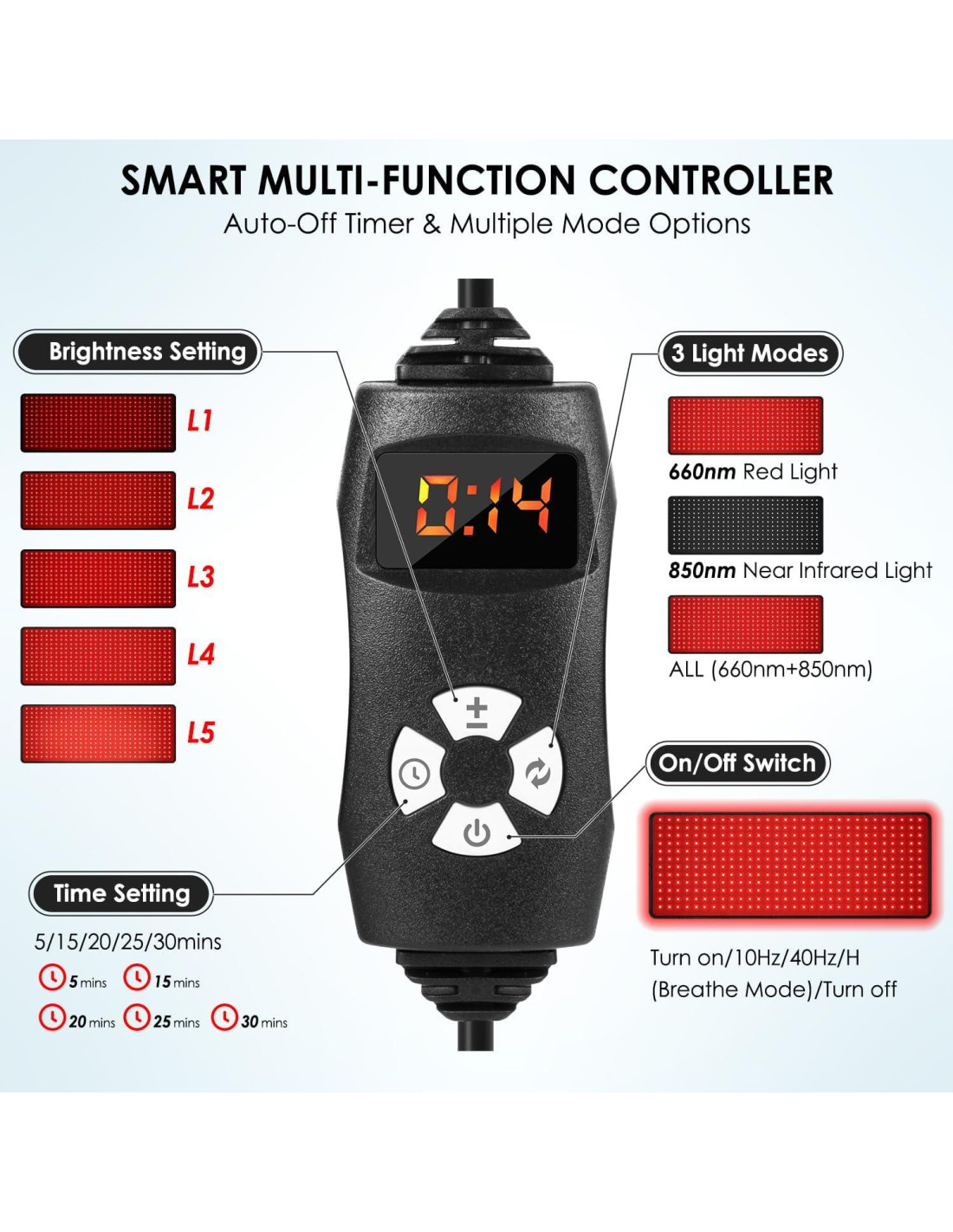 - Modos Personalizables --- La almohadilla de terapia de luz roja está diseñada con modo de respiración, modo de pulso de 10Hz y modo de pulso de 40Hz, proporcionando un alivio más rápido del dolor con luz pulsada durante el dolor. El dispositivo también tiene una función de temporizador, puede configurar el temporizador en 5, 10, 15 o 30 minutos usando el control remoto y también puede ajustar la temperatura (Configuración de Temperatura: L1, L2, L3, L4, L5), puede elegir el brillo y el tiempo apropiados según sus necesidades individuales y área de tratamiento.