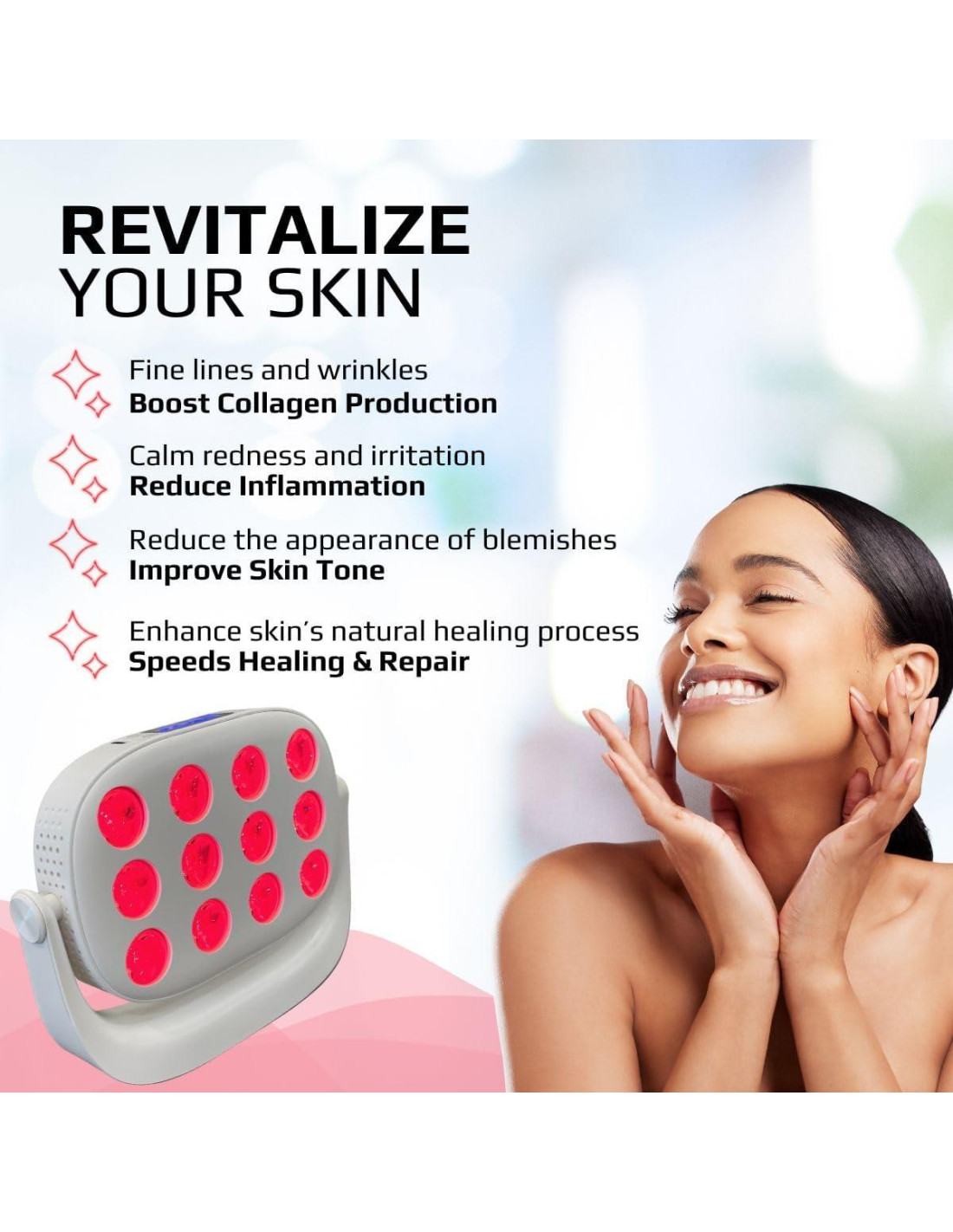 - Los Beneficios de la Terapia de Luz Roja Incluyen: Mejora de la Función Celular, Mejora del Flujo Sanguíneo, Sueño Más Largo y Reparador, Recuperación Muscular Acelerada y Piel Más Saludable