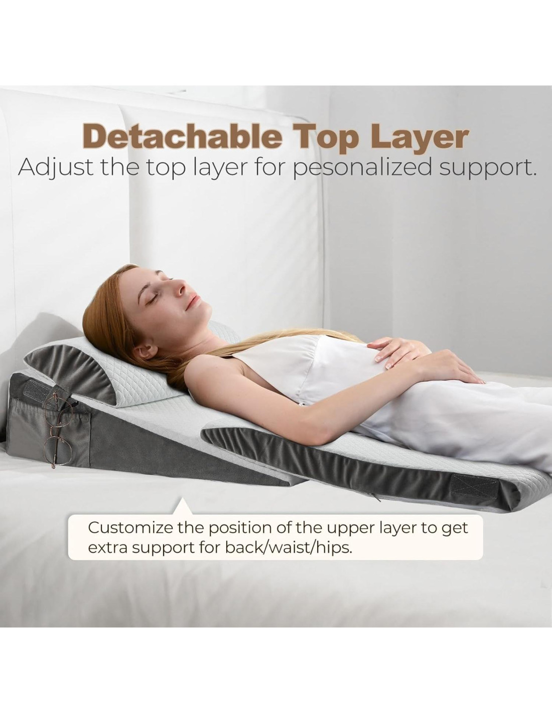 - [Diseño de dos capas]: Nuestro cojín en cuña cuenta con un innovador diseño de espuma independiente de dos capas, cada una con un nivel diferente de suavidad. La capa superior se puede desmontar, ofreciendo dos opciones, brindando una experiencia más personalizada y cómoda.