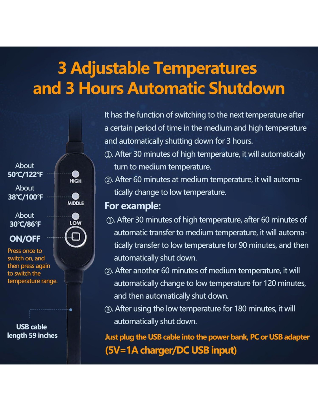 - Respecto a la función de calefacción por USB, este producto no se puede recargar, solo puede mantener el cable USB conectado a la fuente de alimentación para usar la función de calefacción, no hay enchufe ni fuente de alimentación en el paquete, solo un cable USB con controlador. Al usar, necesitas conectar el cable USB a la batería externa, PC o adaptador USB (5V=1A cargador/DC entrada USB). No uses la función de calefacción en un espacio cerrado sin disipación de calor, como una colcha, para evitar quemaduras.