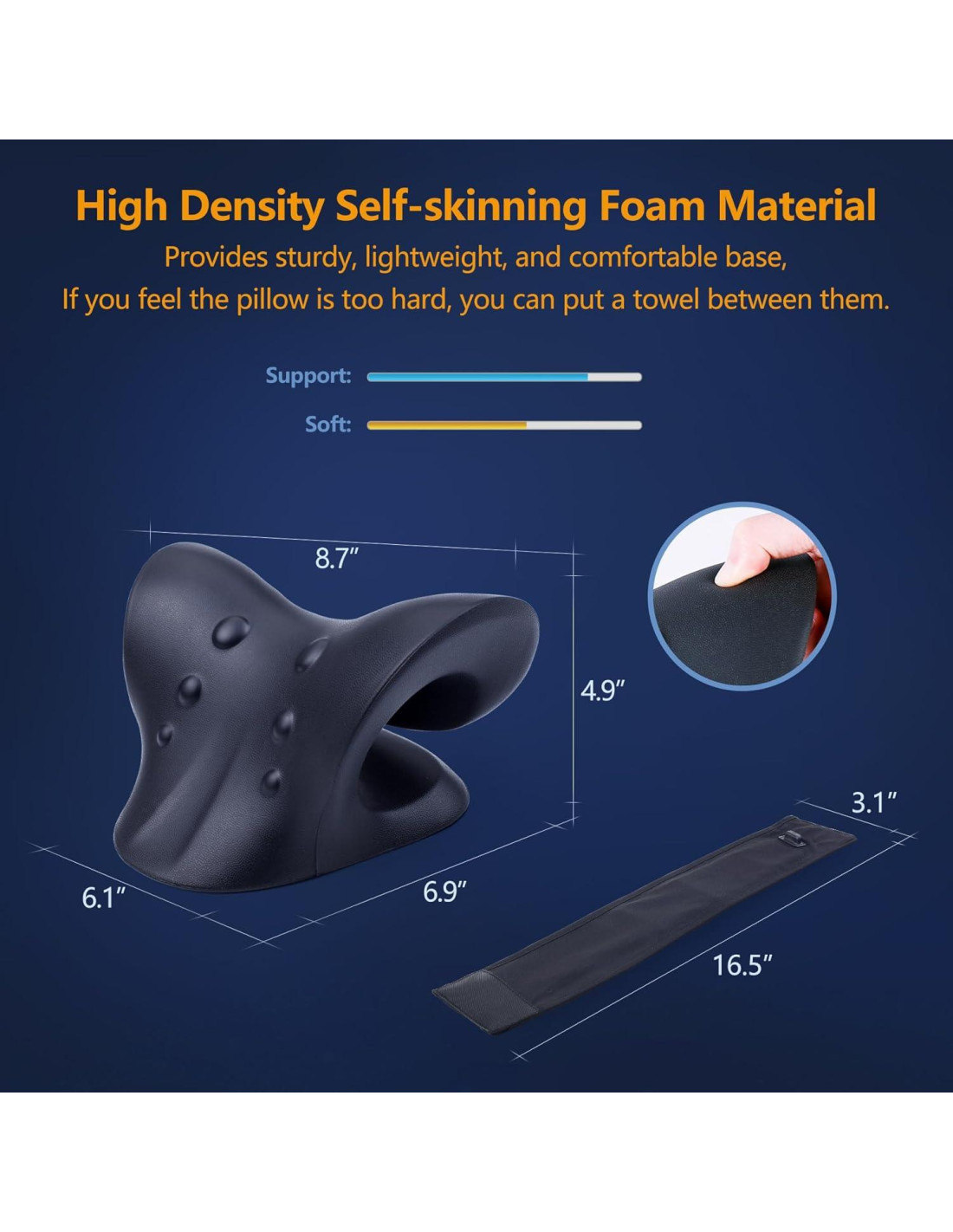 - [¿Cuál es el Material?] Este dispositivo estirador cervical está hecho de espuma de alta densidad de auto-piel. La base firme y robusta ofrece un fuerte soporte para la columna cervical. El dispositivo de tracción cervical es duradero y no se deforma fácilmente, el estiramiento asistido por gravedad crea la cantidad de tracción necesaria según tu peso corporal.