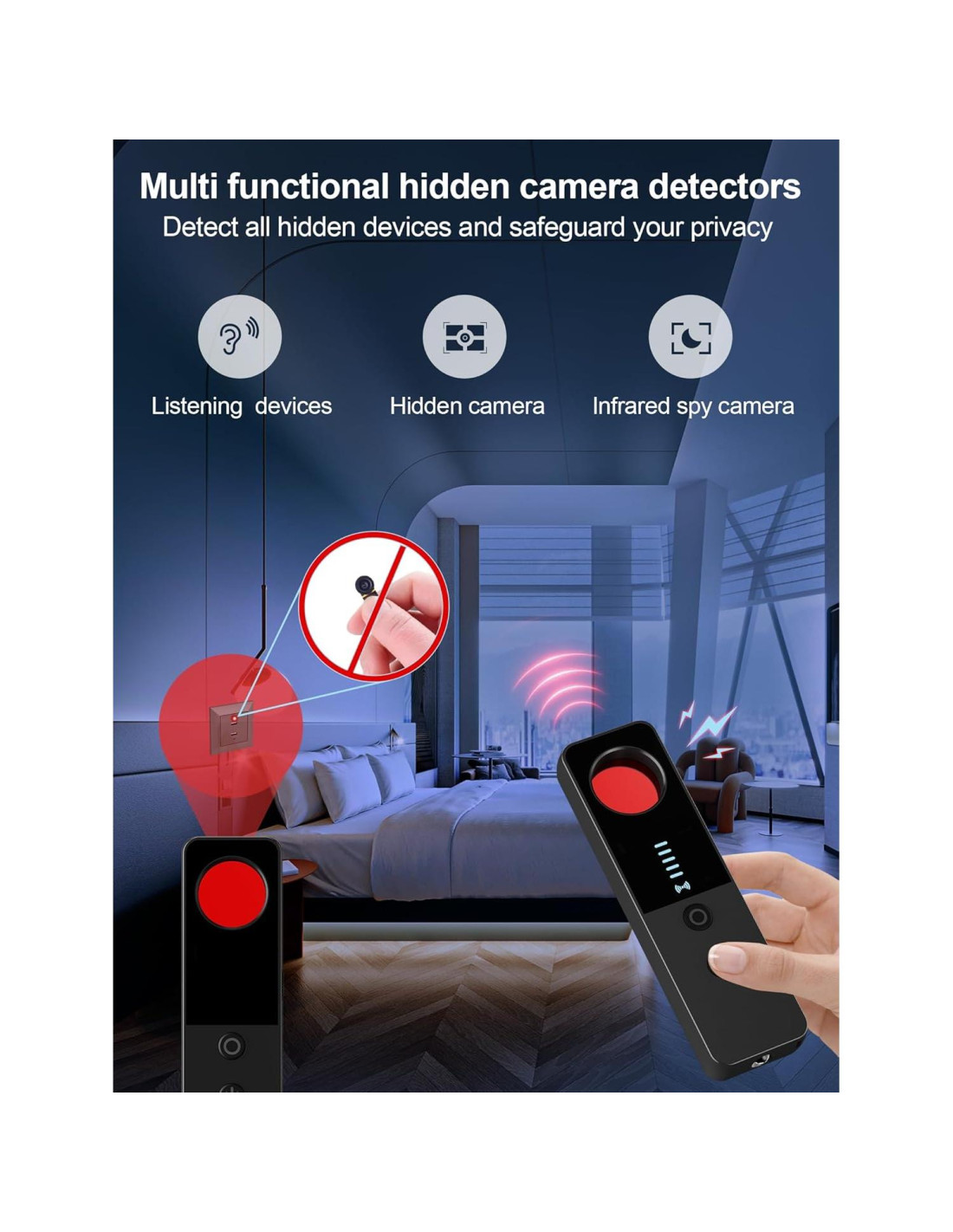 - Detector anti-espía versátil. Este detector de contra vigilancia todo en uno ofrece múltiples modos de detección potentes para proteger contra el rastreo, espionaje y grabación. Cuenta con un escaneo avanzado de señales RF para localizar rastreadores GPS y dispositivos de escucha inalámbricos, detección infrarroja altamente sensible para identificar cámaras de visión nocturna, detección de campo magnético y detección precisa de cámaras ocultas.