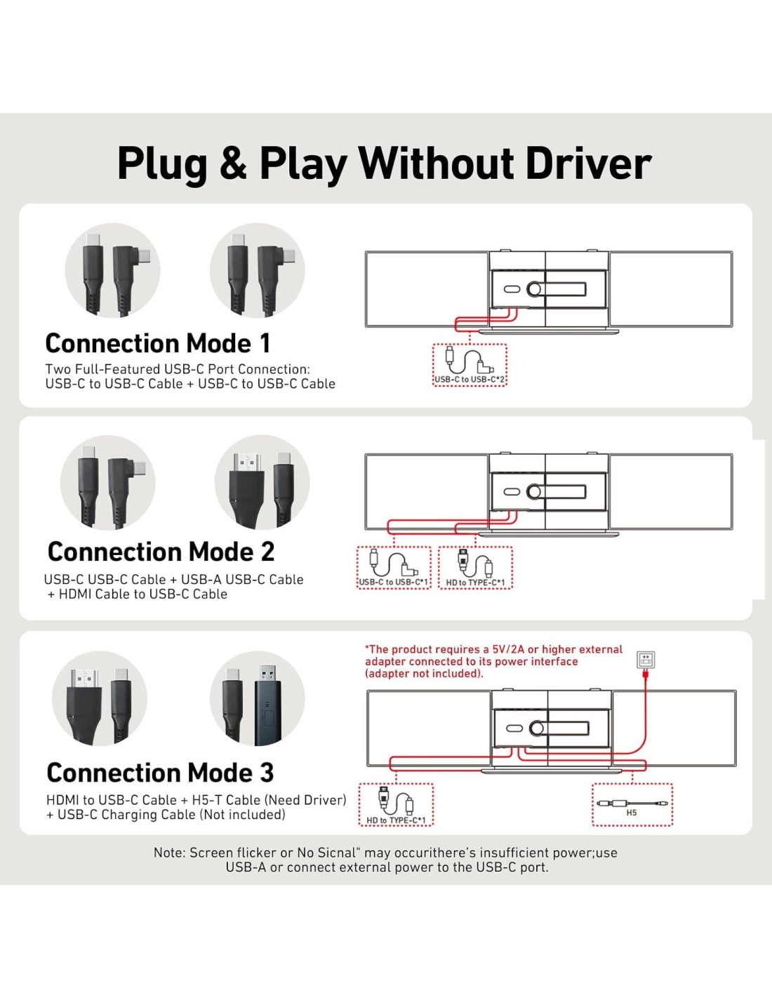 - [PLUG & PLAY SIN CONTROLADOR] El mejor monitor portátil para laptop incluye todos los cables esenciales (Type-C*2, USB-C a USB-A, HDMI, H5-T) para una conectividad inmediata a cualquier laptop. Simplemente conecta y reproduce a través de Type-C*2/Type-C+HDMI+fuente de alimentación. *Nota: extensor de pantalla "Sin Señal", solo proporciona energía adicional para activar la pantalla. El dispositivo funciona sin una batería integrada y debe ser alimentado a través del USB de la laptop o una fuente de adaptador de energía externa.
