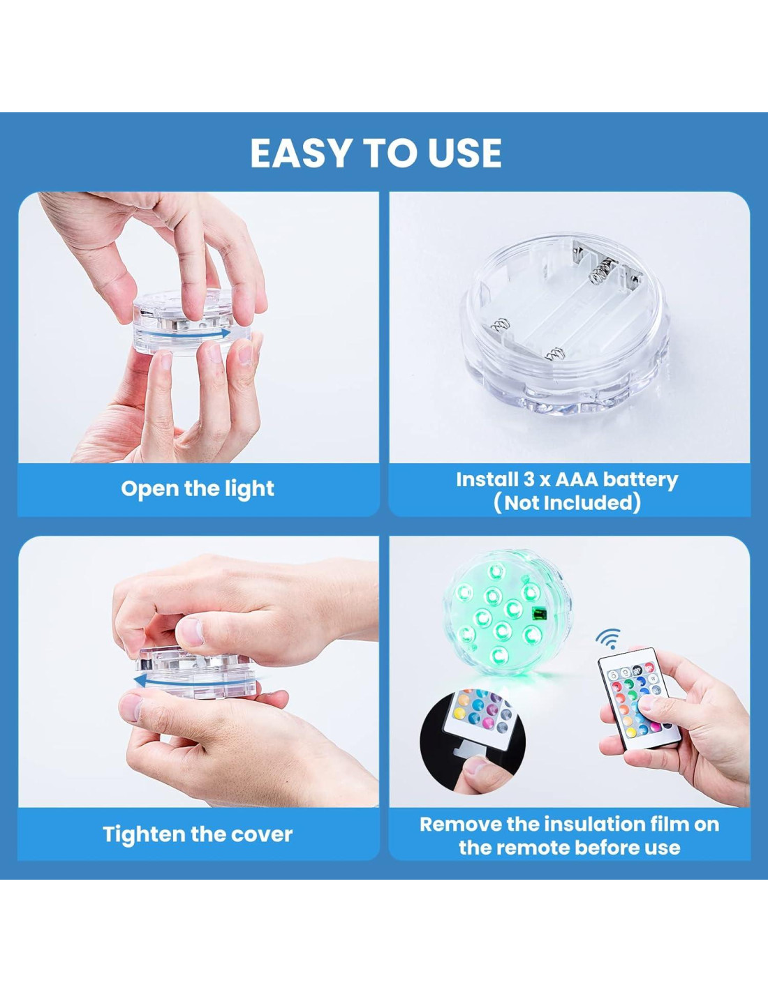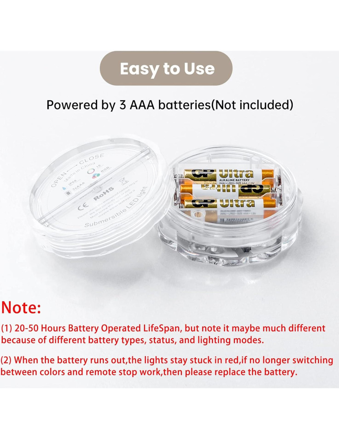 - Alimentado por Batería: Cada luz necesita 3 x baterías AAA (no incluidas). Equipado con control remoto IR dentro de una distancia de 3M-10M, un control remoto puede controlar todas las luces. Nota: (1) 20-50 Horas de Vida Útil de Batería, pero tenga en cuenta que puede ser muy diferente debido a diferentes tipos de baterías, estado y modos de iluminación. (2) Cuando la batería se agota, las luces se quedan atascadas en rojo, si ya no cambian entre colores y el control remoto deja de funcionar, entonces por favor reemplace la batería.