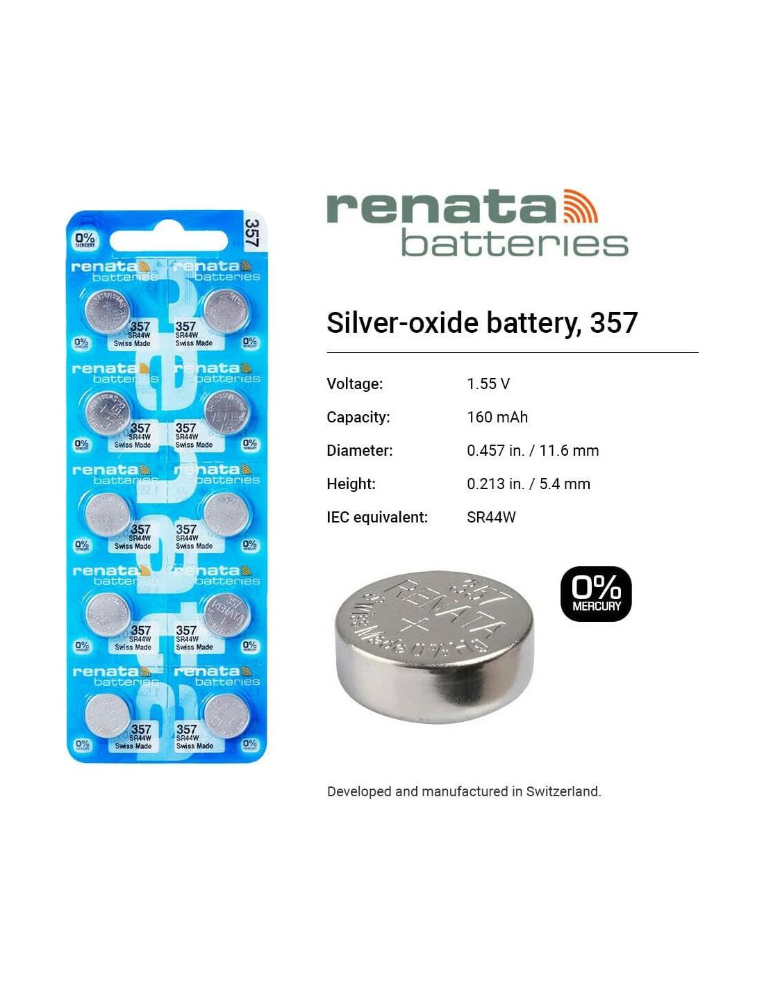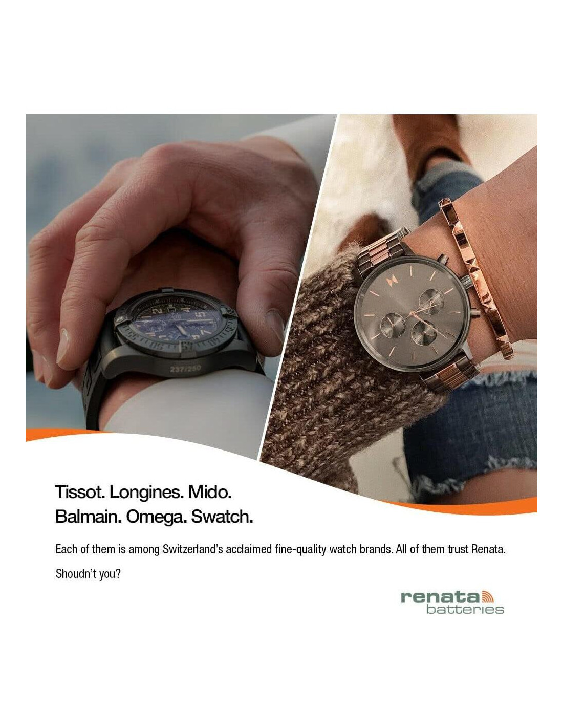 Renata fue fundada en Suiza en 1952 para producir piezas mecánicas para relojes de pulsera. Para la década de 1970, su enfoque se trasladó a la investigación y desarrollo de celdas de óxido de plata de alta calidad para alimentarlos. Renata tiene experiencia en el proceso de producción de baterías de principio a fin. Su planta de producción moderna y altamente automatizada incorpora un extenso sistema de pruebas de calidad. Además de baterías para relojes, Renata fabrica celdas de litio para electrónica de consumo. La investigación, el desarrollo, la producción y las pruebas de calidad se agrupan en la sede de Itingen, Suiza. Renata está certificada ISO 9001 e ISO 14001 por Bureau Veritas (Suiza, actualizado en diciembre de 2020). 100% libre de mercurio. Dedicada a alta y baja descarga para un rendimiento óptimo. Tecnología de sellado a prueba de fugas sofisticada y retención de alta capacidad. Fecha de frescura completamente transparente. Solapa de fácil pelado para una fácil extracción de las baterías. Empaque pre-perforado para separar fácilmente los paquetes de burbujas. Desarrollada en cooperación con la Federación de la Industria Suiza de Relojes, Renata ofrece su línea de baterías de óxido de plata sin mercurio en más de 30 tamaños. Estas baterías de calidad están diseñadas para alimentar relojes y dispositivos electrónicos que requieren energía compacta, duradera y de bajo voltaje. Renata es una empresa del Grupo Swatch junto a marcas suizas reconocidas que incluyen Swatch, Tissot, Longines y Omega. Renata ofrece baterías de litio de 3 voltios en una amplia gama de tamaños. Probadas y aprobadas en laboratorio (Dynamis Batterien, Alemania, 2019, #UN_017_51), las celdas de moneda de litio Renata cumplen con altos estándares de calidad para brindarle una excelente confiabilidad. Úselas para proporcionar respaldo de memoria, o para alimentar sus dispositivos médicos y de fitness, equipos de medición y sensores, dispositivos de seguridad, gadgets de entretenimiento, controles remotos y más. Explore nuestra línea completa de baterías de zinc-aire Renata diseñadas para alimentar tanto dispositivos analógicos como digitales. Su alto voltaje constante asegura una larga vida útil de la batería. Empacadas en tarjetas de marcación fáciles de usar, tenemos todos los tamaños populares: 10, 312, 13 y 675. Las baterías Renata están fabricadas con precisión en Suiza y Alemania.