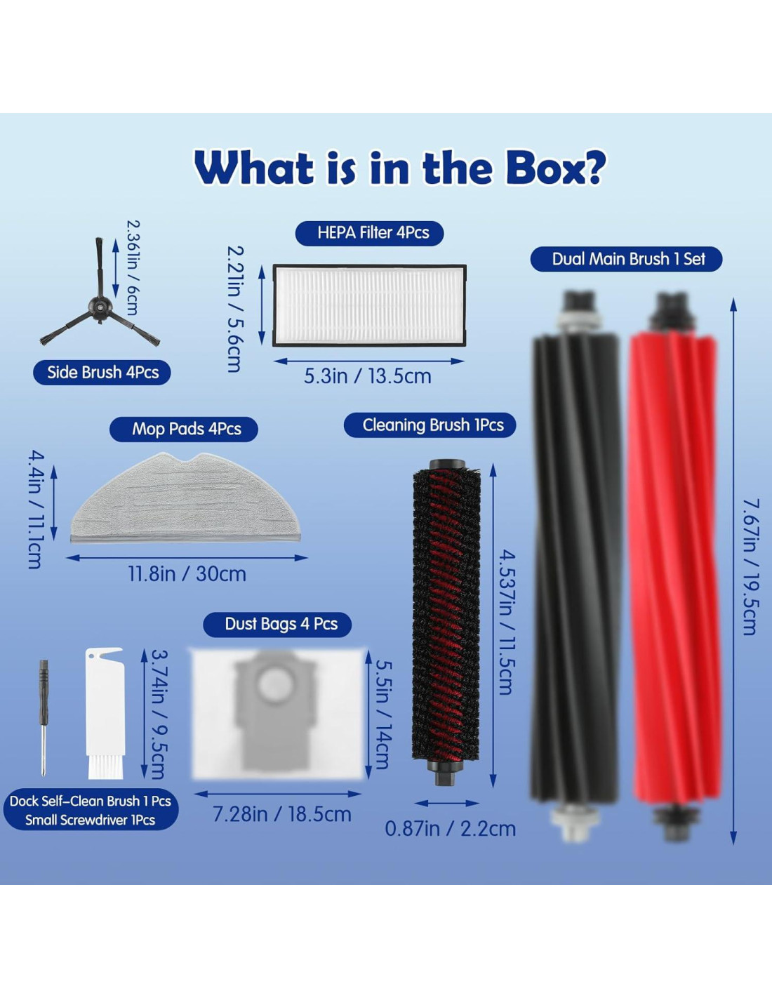 - Componentes incluidos: 1 Cepillo Principal Doble, 1 Cepillo de Limpieza de Alta Velocidad, 4 Bolsas de Aspiradora, 4 Cepillos Laterales, 4 Filtros HEPA, 4 Paños de Mopa, 1 Cepillo de Limpieza, 1 Destornillador.