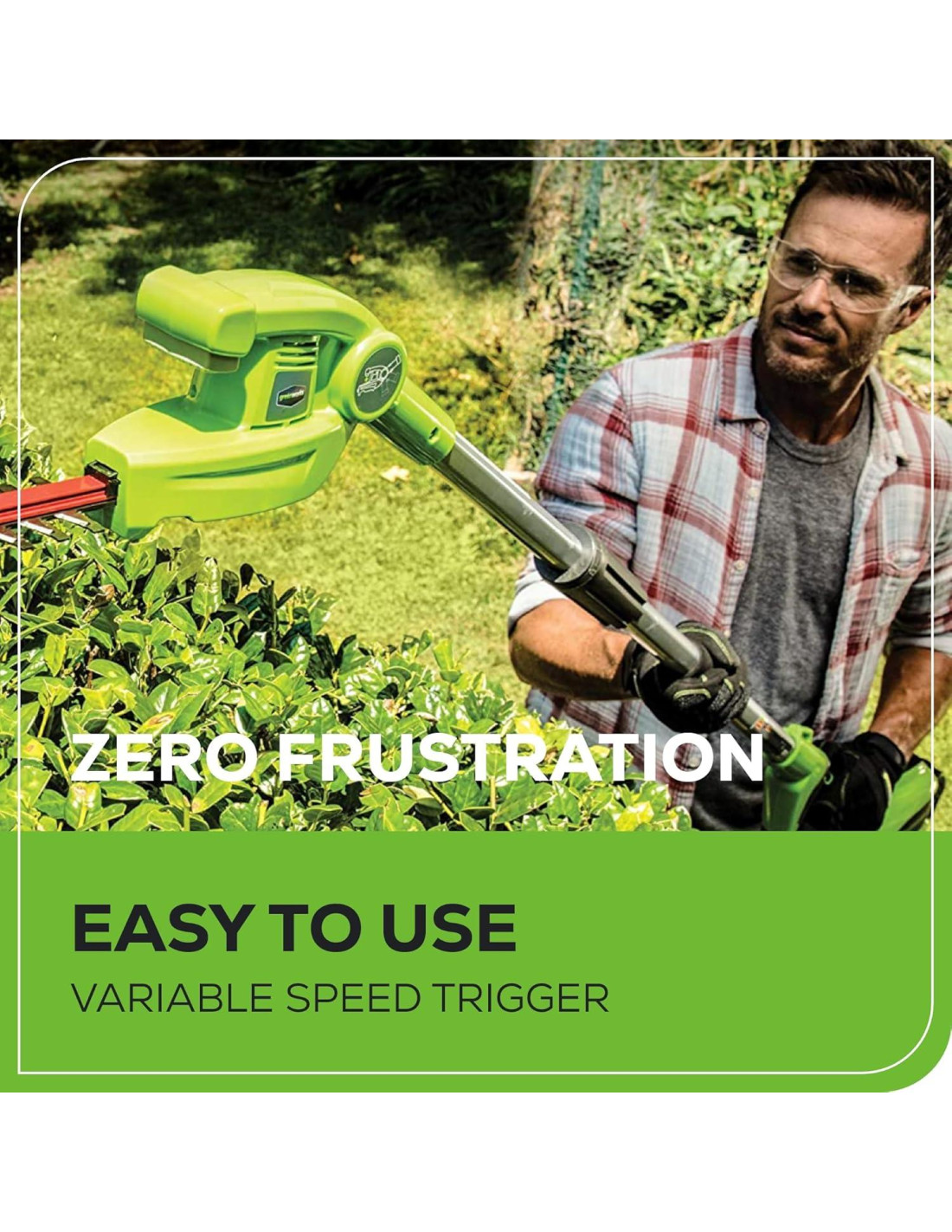 Descubre la conveniencia y eficiencia del sistema 40V de Greenworks, que cuenta con una extensa colección de más de 25 herramientas de jardín premium en una sola plataforma de batería. Mantén tus árboles y setos recortados y saludables mientras aumentas tu atractivo exterior con nuestro versátil Kit Combo de 40V, que incluye una sierra de poste y una cortadora de setos de poste. La barra y cadena de 8" (sierra de poste) hacen que recortar ramas sea muy fácil, mientras que la hoja de doble acción de 20" (cortadora de setos de poste) asegura un rendimiento óptimo para recortar setos altos. Una cabeza pivotante de 7 posiciones permite recortar en varios ángulos. Disfruta de un ajuste rápido de la cadena de la sierra de poste con un fácil tensado y una vida útil extendida de la cadena gracias al aceite automático que aplica aceite a la barra y la cadena. Experimenta un funcionamiento prácticamente libre de mantenimiento sin gasolina, aceite ni emisiones. Nuestra combinación de sierra de poste y cortadora de setos de poste arranca al instante, opera en silencio y entrega la potencia que necesitas para todos tus proyectos al aire libre. Ahorra en modelos solo de herramientas o conjuntos completos con batería, y confía en la garantía de 3 años para herramientas y baterías para proteger tu inversión. Desbloquea el potencial del sistema 40V de Greenworks para todas tus necesidades de cuidado del jardín.