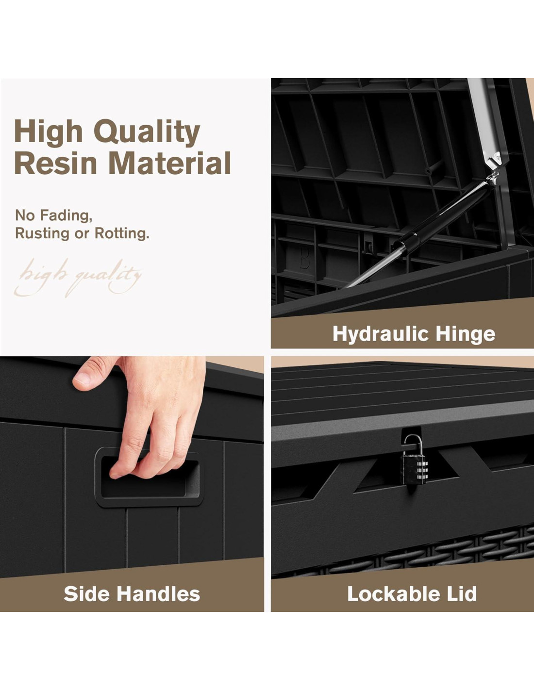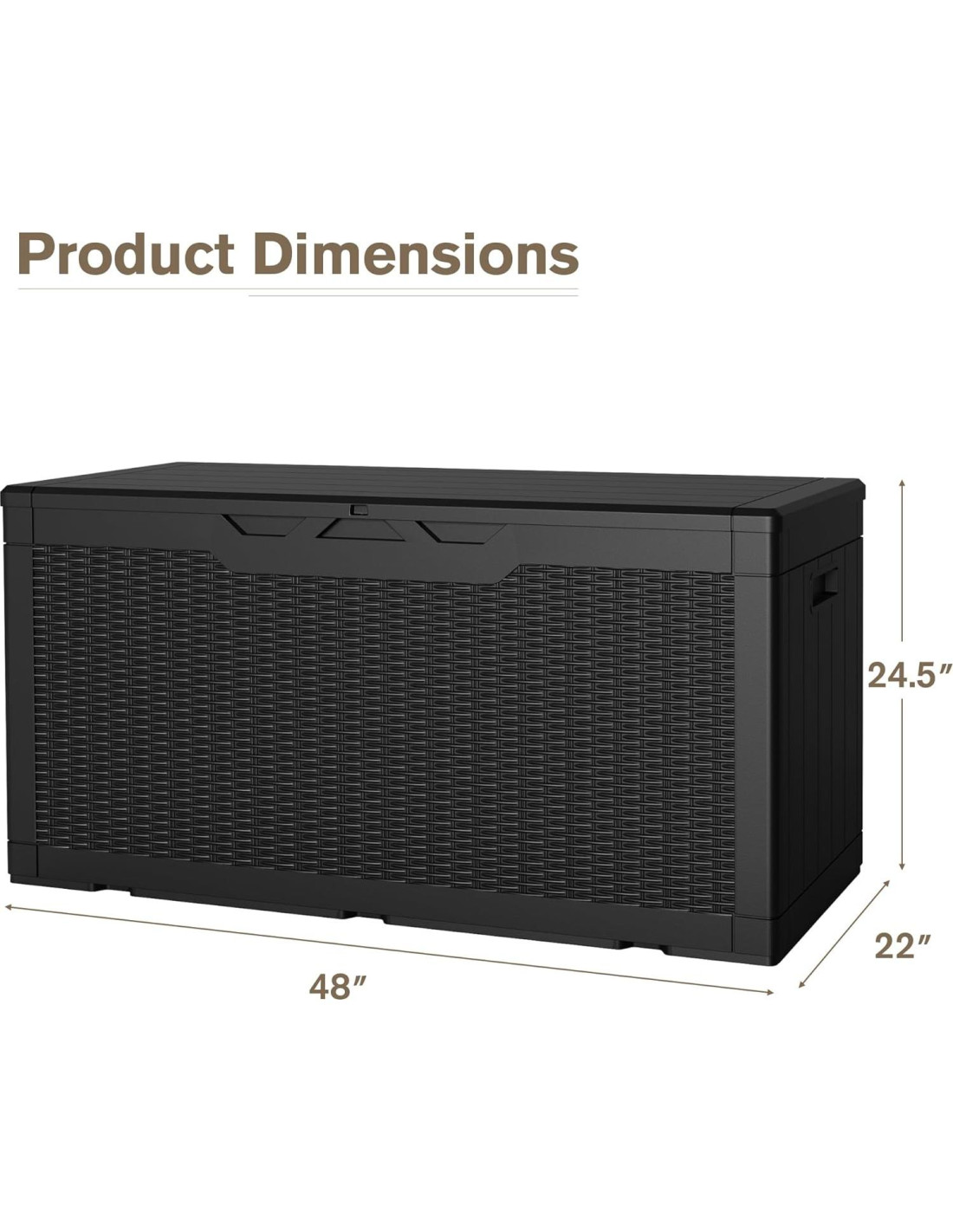 Jummico se compromete a crear una vida hogareña cómoda para ti, satisfaciendo las necesidades de los consumidores y ofreciendo una gama más amplia de opciones. Si buscas una solución de almacenamiento confiable y espaciosa, no busques más que nuestra caja de almacenamiento de 378.5 litros. Con su construcción duradera y gran capacidad, es la adición perfecta para tu hogar o garaje. ¡Ordena ahora y experimenta los beneficios de una vida organizada! Características: Tapa bloqueable protege tus artículos de pérdidas. Material de resina de alta calidad para un uso prolongado. Mangos incorporados en cada lado para un fácil movimiento. Diseño de varilla de aire hidráulica permite abrir y cerrar lentamente para evitar pellizcos en las manos. Especificaciones: Material: Resina Color: Negro/Marrón/Gris/Marrón Claro Tamaño de la caja: 121.9 cm L x 55.9 cm W x 62.2 cm H Capacidad de almacenamiento: 378.5 litros Paquete incluye: -Caja de almacenamiento de 378.5 litros x 1 -Manual de instalación