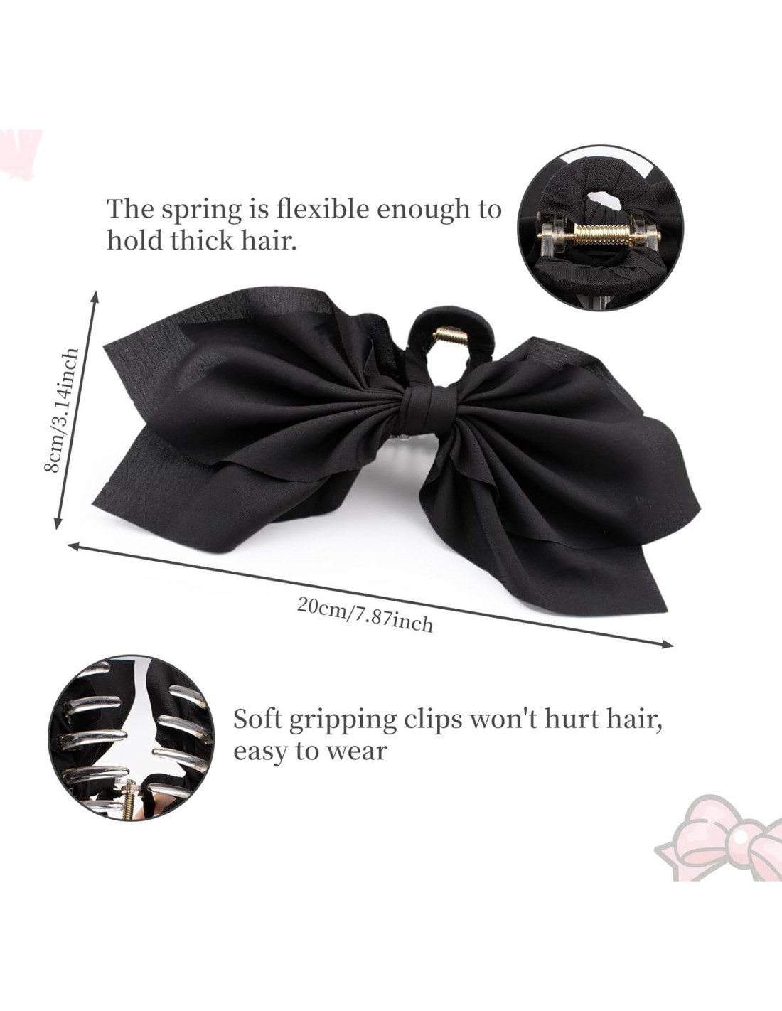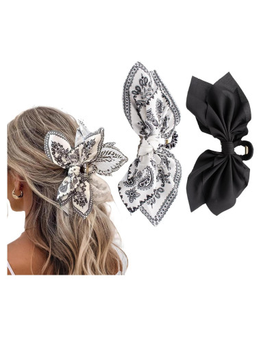 - Estética Elegante: Con su material de satén y grandes adornos de lazo, las opciones de color de los accesorios para el cabello negros y blancos ofrecen un aspecto moderno y a la moda, nuestras pinzas de garra con lazo añaden un toque de elegancia y encanto a cualquier peinado