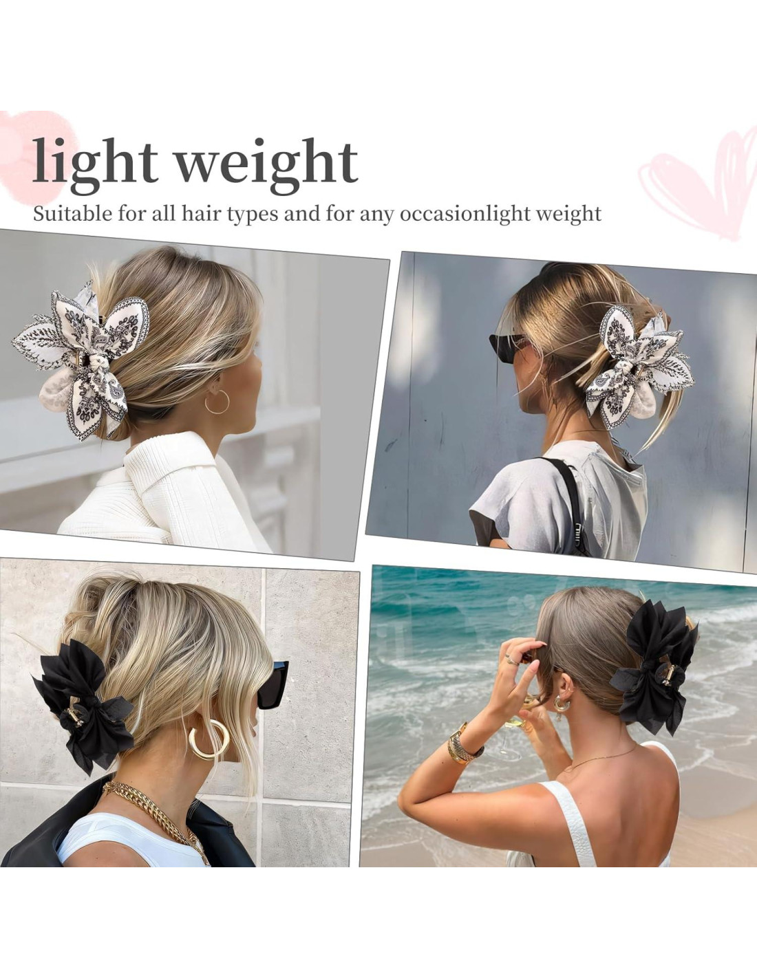 - Posibilidades Infinita de Peinados: Ya sea que asistas a un evento formal, salgas a un paseo casual o simplemente quieras añadir un poco de estilo a tu look diario, nuestras pinzas de garra con lazo son un accesorio versátil que se puede usar para crear varios peinados