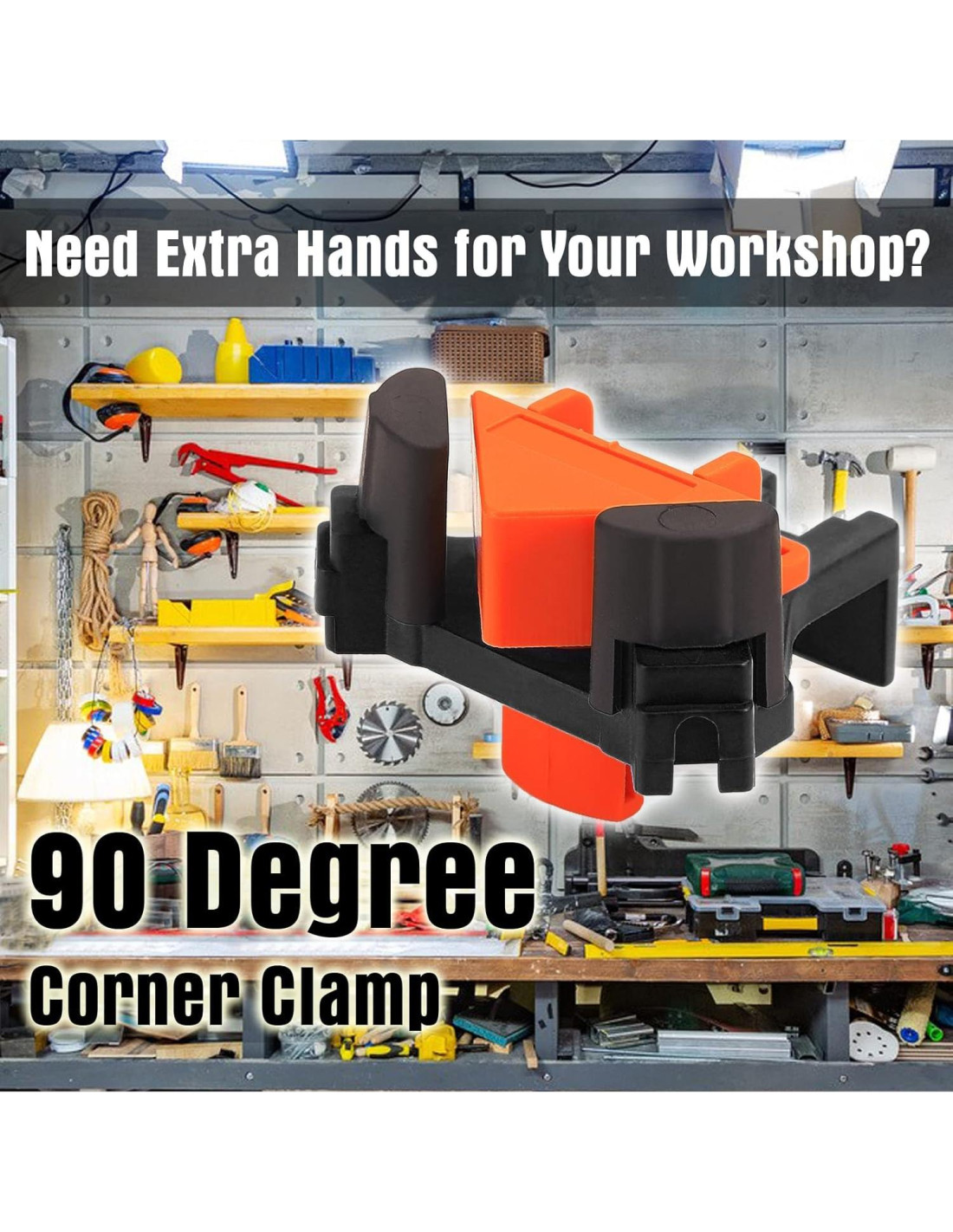 - Ajustable a diferentes grosores de madera. Sujeta rápidamente tableros y marcos de madera en un ángulo de 90 grados. Acomoda tableros con un grosor de 3/16" (0.48 cm) - 1" (2.54 cm) para esquinas de 90 grados y uniones en T.