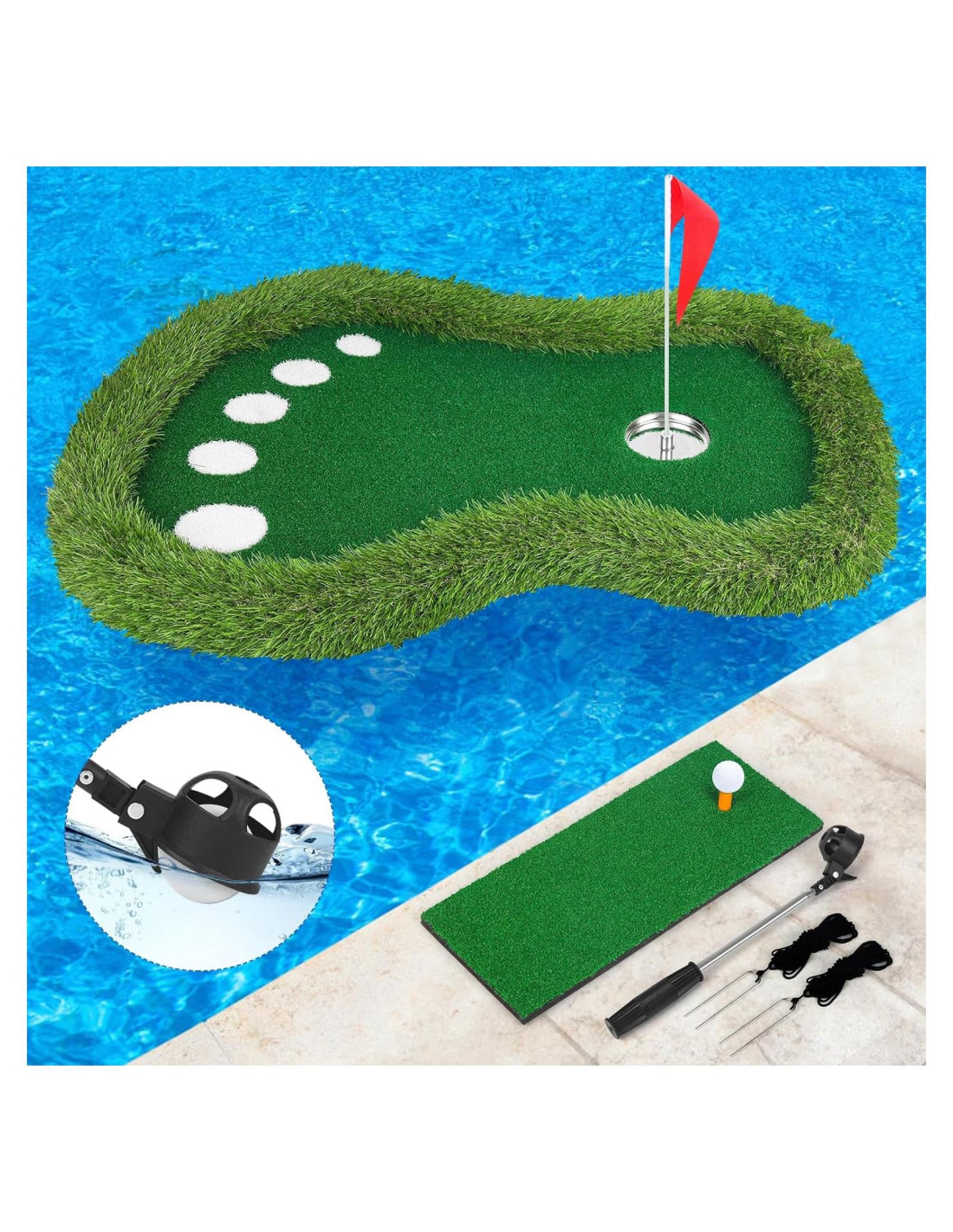 - Recuperador de Pelotas Extra: El recuperador de pelotas es ajustable en longitud, lo que facilita recoger las pelotas de la piscina. Puedes fijar la alfombra de juego de golf en piscina en su lugar con clavos y cuerdas adicionales, lo que también te permite tirar fácilmente de vuelta el green de golf flotante después del juego.