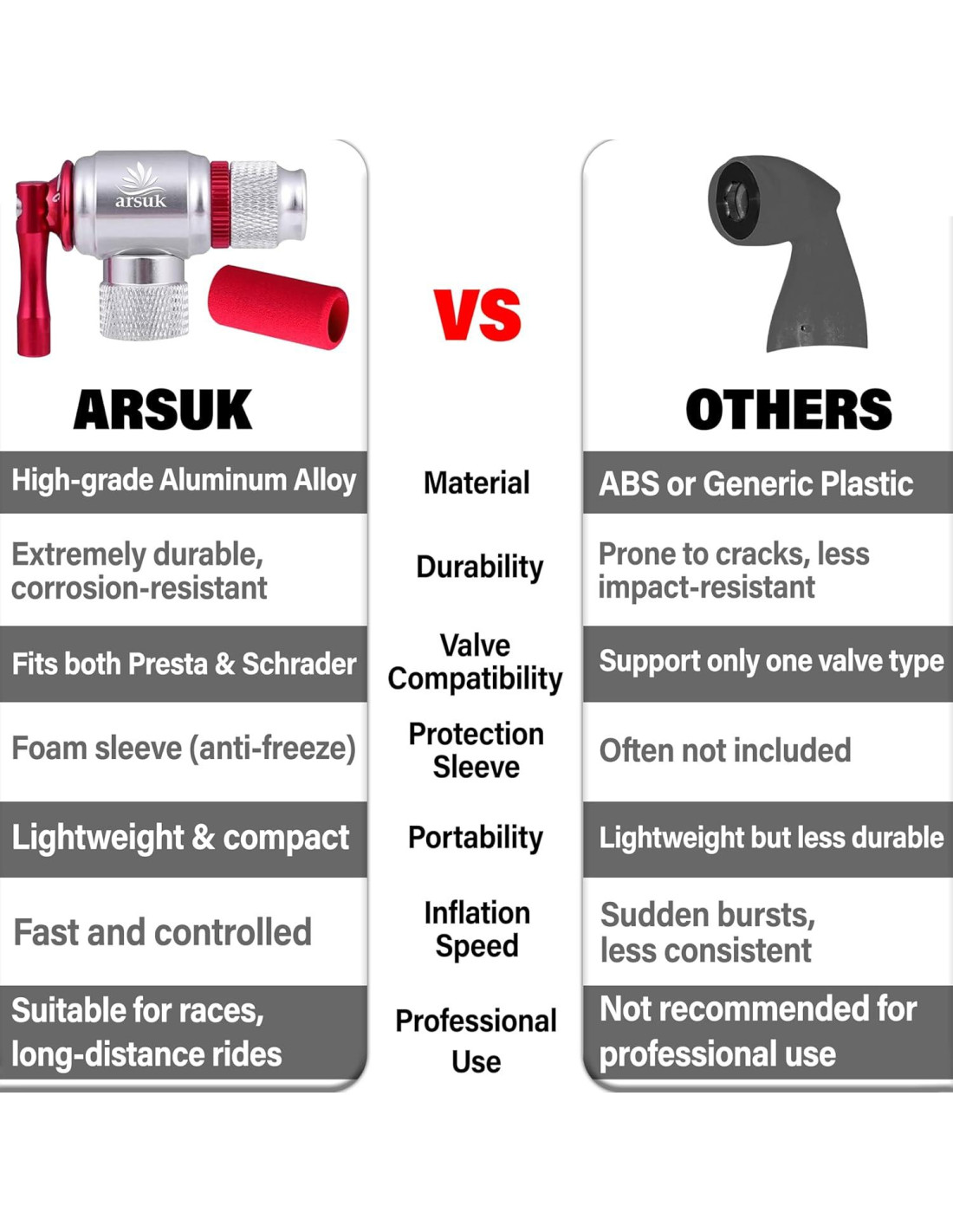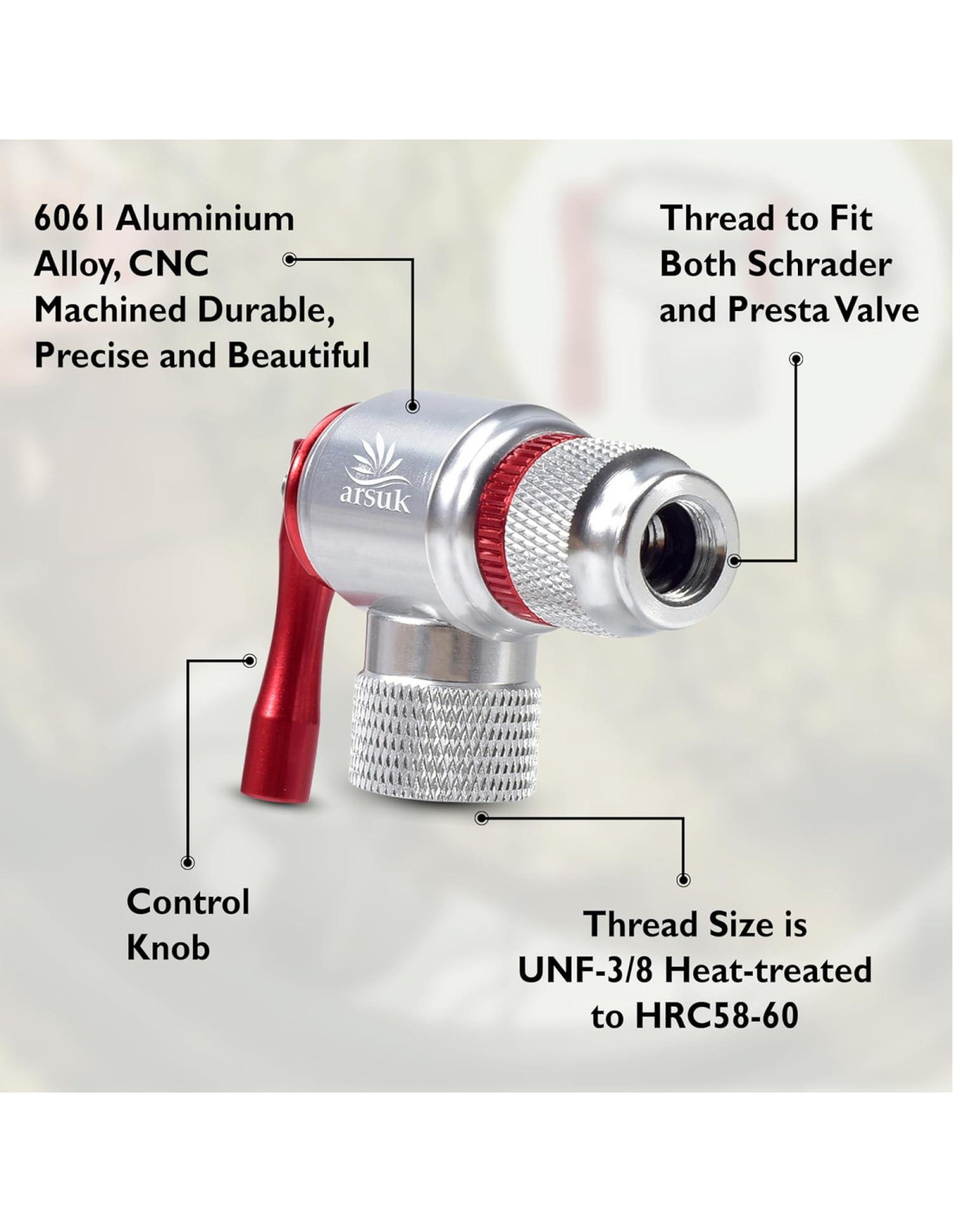 Inflador ARSUK CO2 con Manga Aislante Rápido y Fácil Compatible con Presta - Bomba de Neumáticos de Bicicleta para Bicicletas de Carretera y Montaña