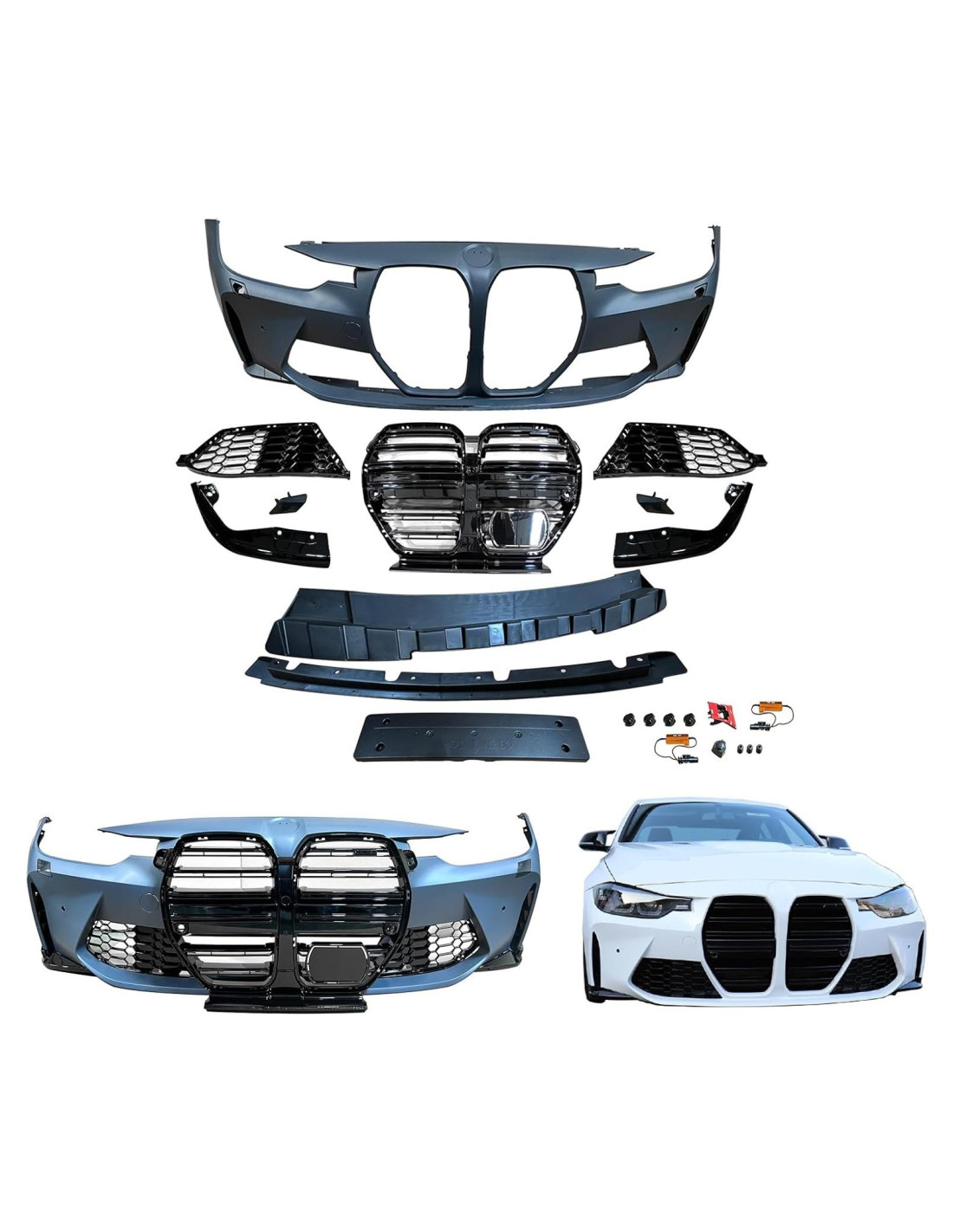 - [Paquete incluye] - 1 x Cubierta de Parachoques Frontal con agujeros para sensores de asistencia de estacionamiento; con agujeros para lavadora, 1 x Rejilla de Parachoques Frontal con agujero para cámara, 1 x Recorte de Conexión Inferior de Parachoques Frontal, 1 x Escudo de Salpicaduras de Parachoques, 2 x Cubierta de Niebla, 2 x Soporte de Parachoques Frontal, 1 x Placa de Licencia Euro, 1 x Emblema 'W' (como se muestra en las imágenes)