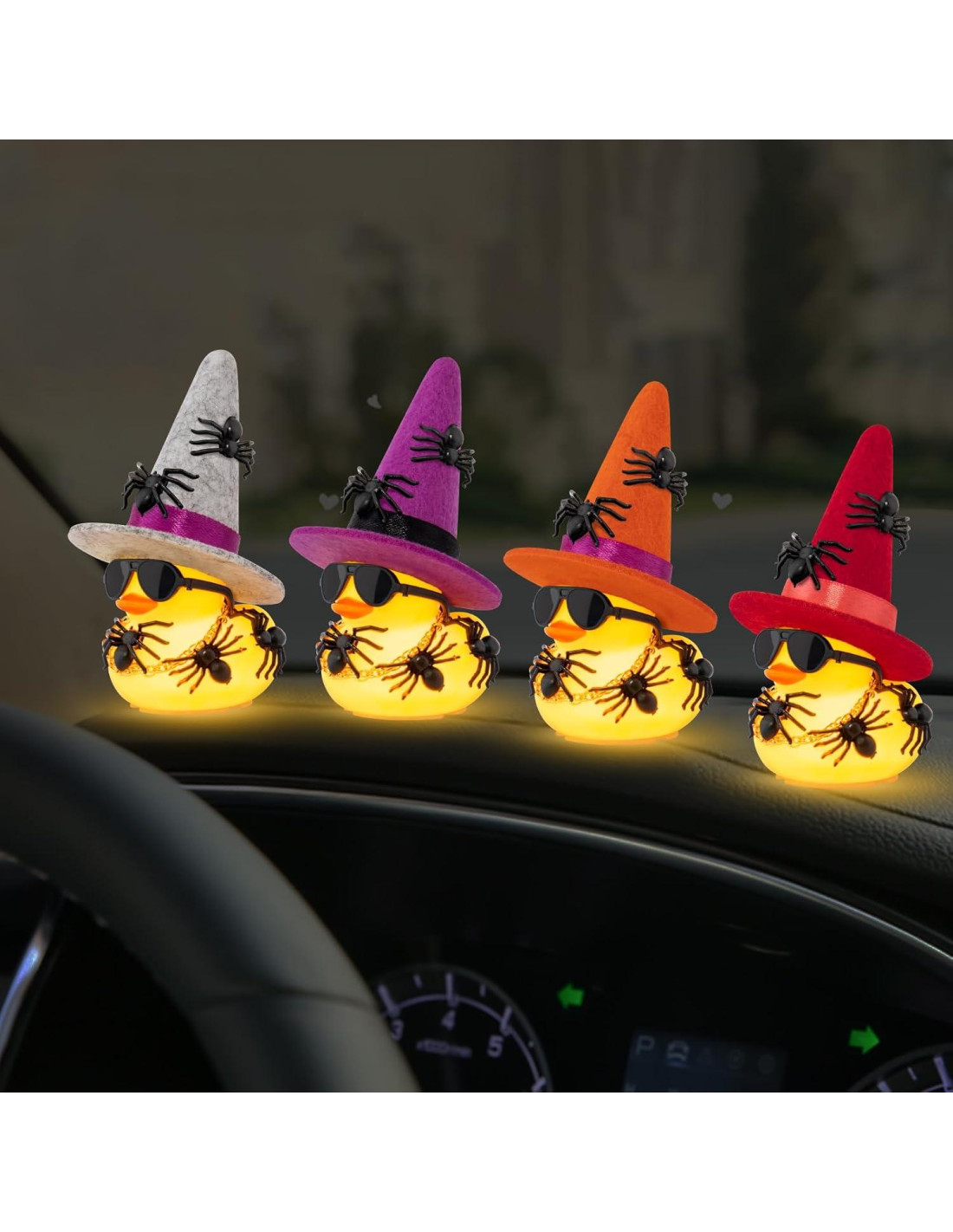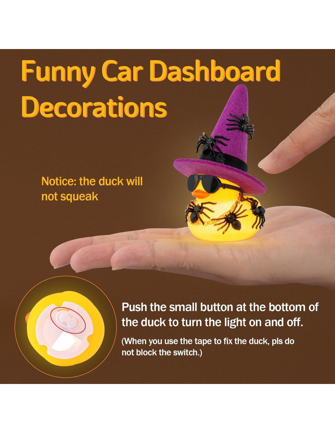 Estos patos de coche de Halloween con luz están equipados con sombrero de halloween, 5 mini arañas, gafas de sol negras, collar de cadena dorada y cinta de doble cara, un pato único y adorable para decorar nuestro coche.