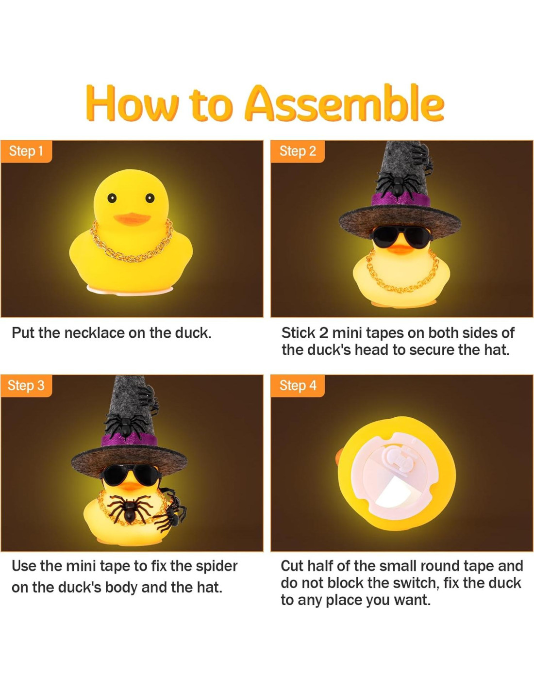 - Pato de Goma Araña con Luz: Este pato de goma amarilla iluminado presenta un sombrero de halloween, gafas de sol, collar dorado, 5 mini arañas y cintas de doble cara. Nota, el pato no hará ruido. Presiona el interruptor en la parte inferior para encender y apagar la luz del pato